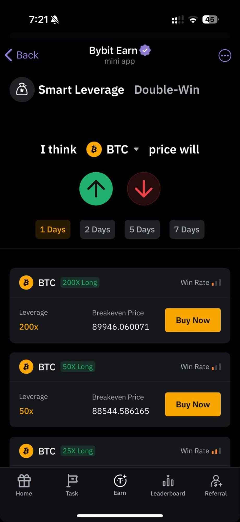 The Bybit Mini App allows you to earn points by completing simple tasks, which can then be redeemed for rewards. It also provides convenient access to Bybit Earn products like Smart Leverage and Double-Win. Plus, the Mini App makes it easy to participate in the Bybit Referral Program, where you can invite friends using your referral link or code to earn rewards.