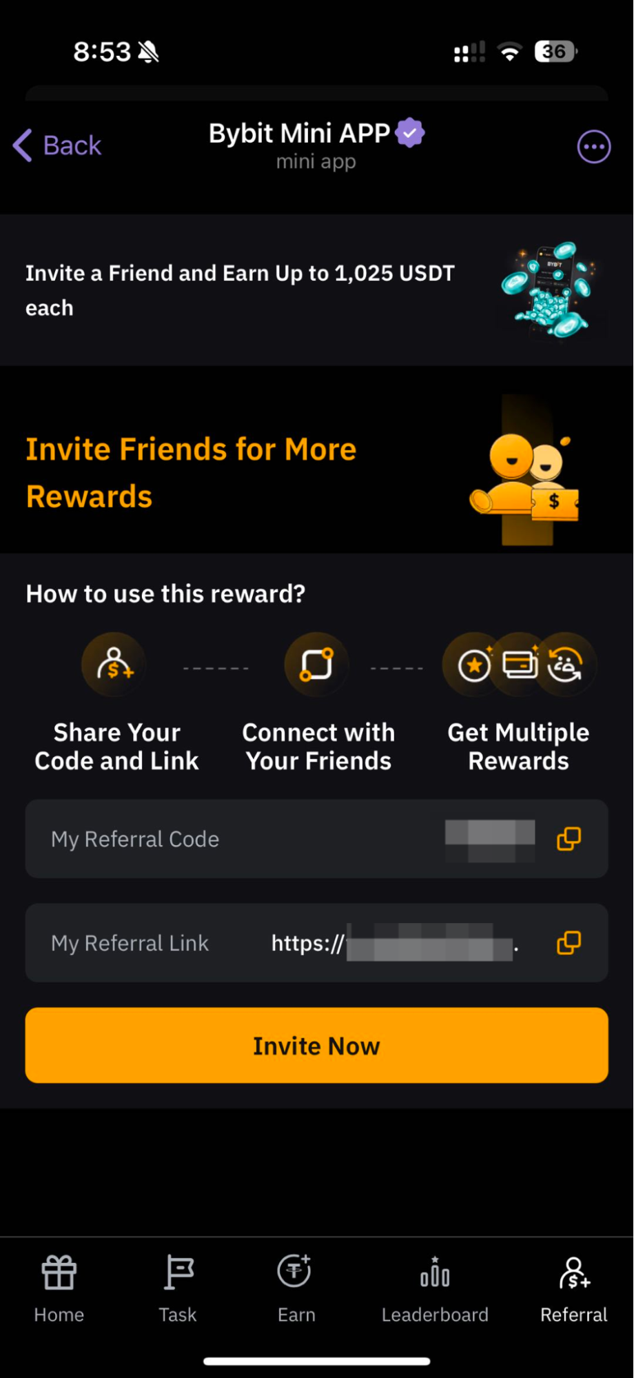 To invite friends, tap the Referral tab in the Bybit Mini App. You can then share your referral code or link with your Telegram contacts.