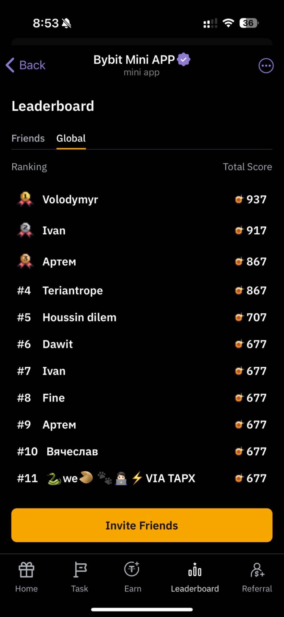 The Leaderboard displays the global ranking of points earned by Bybit Mini App users, along with a list of friends you have invited through the Mini App.