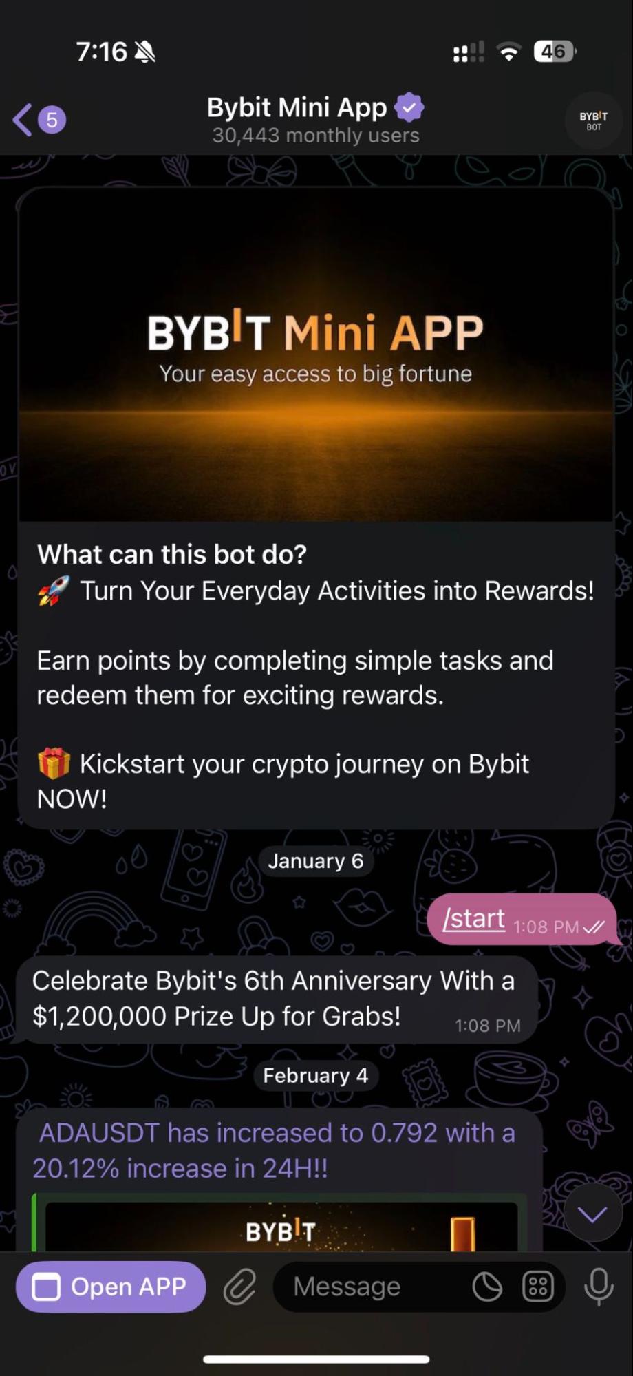 You can access the Bybit Mini App through @Bybitglobal_Official_Bot or via this link. Make sure it has the official verification checkmark to avoid scams.