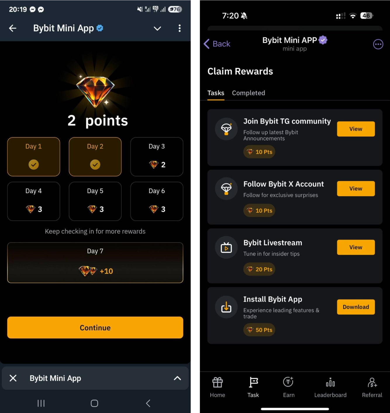 • Daily Check-in: Log in to the Mini App every day to complete your check-in.