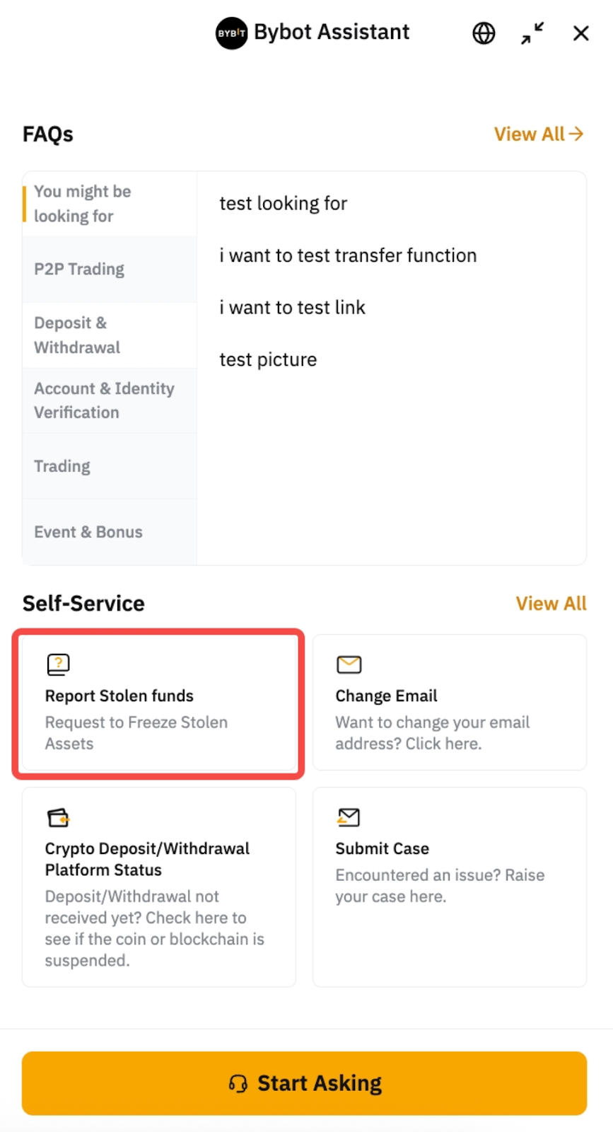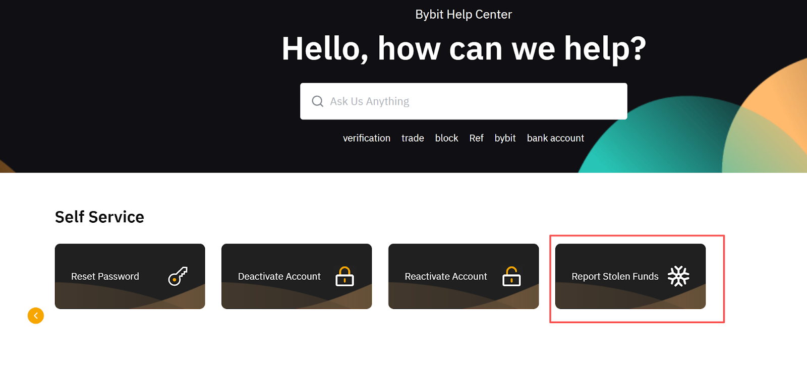 If you've fallen victim to cyber theft and the stolen funds were transferred to Bybit, you can report the case and request assistance from our Security team in recovering your assets.