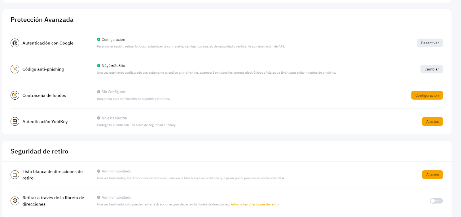 Al activar esta función, la dirección de retiro recién agregada no podrá ser utilizada para realizar retiros durante las siguientes 24 horas. Esto proporciona un nivel adicional de seguridad y ayuda a evitar retiros no autorizados. Visite este enlace para gestionar la seguridad de sus reintegros.