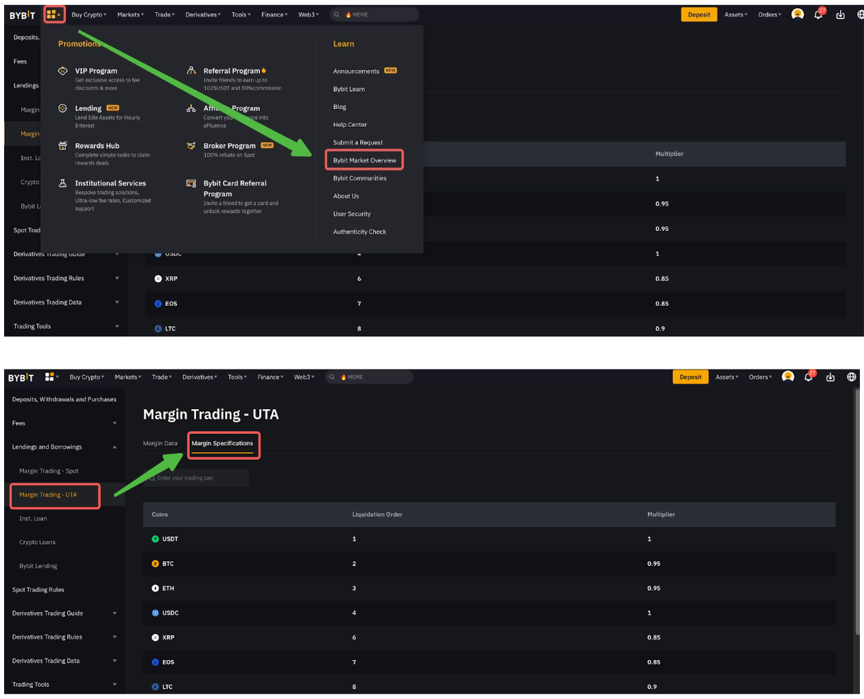 Haz clic en Préstamos y préstamos → Trading con margen-UTA → Especificación de margen y podrás ver la relación de valor de garantía para cada moneda.