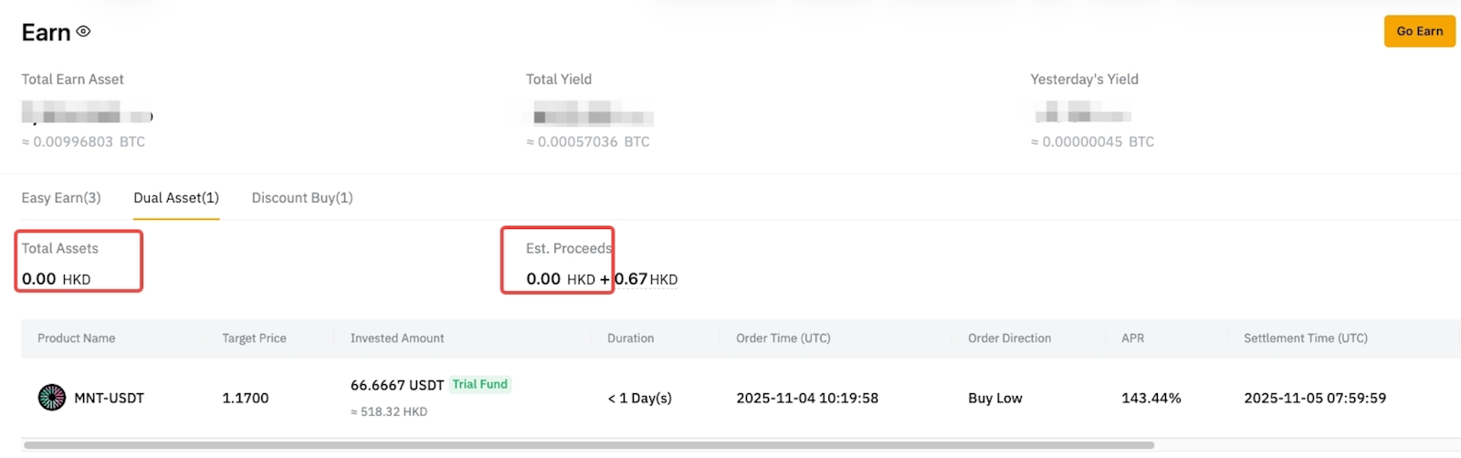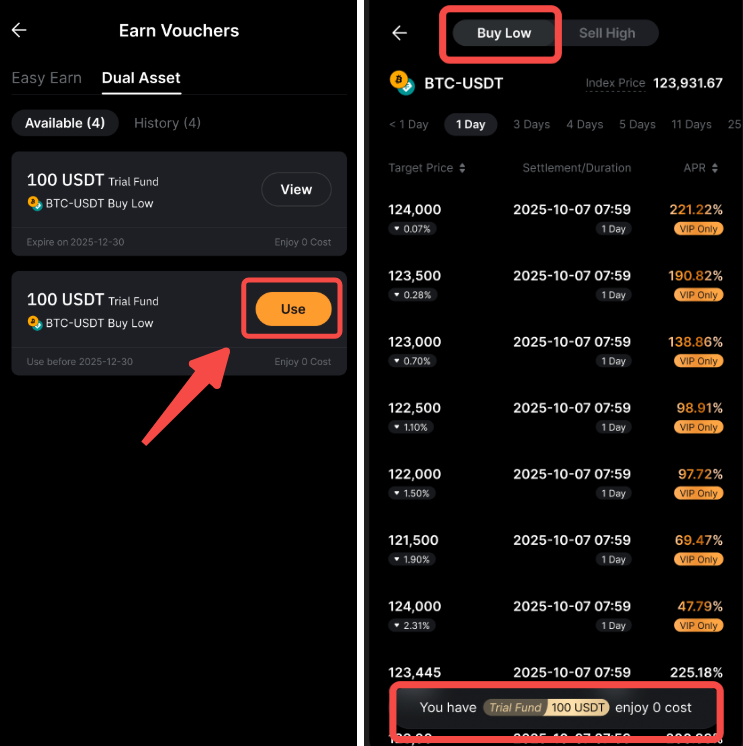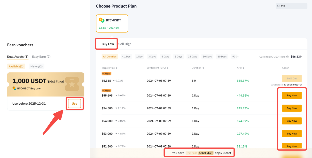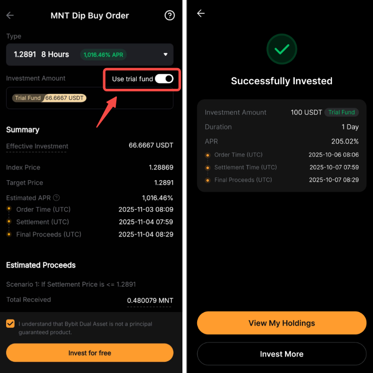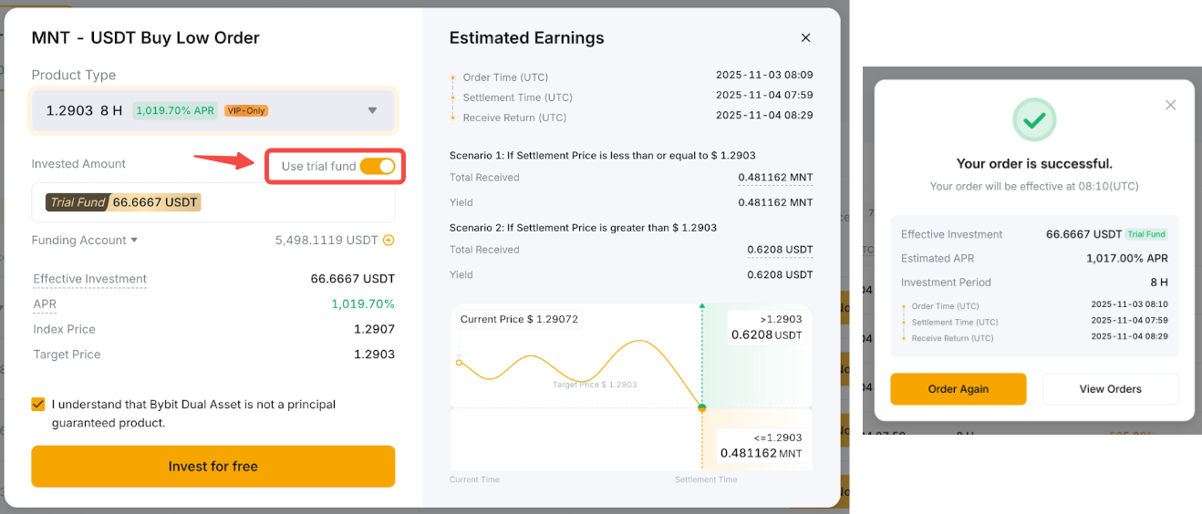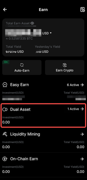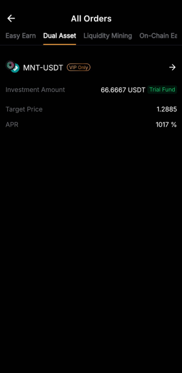 El fondo de prueba Dual Asset le permite experimentar retornos reales de Dual Asset sin incurrir en costos. Sus ganancias están determinadas por el precio de liquidación del producto y el APR. Si bien el rendimiento se agregará a su cuenta, el capital del fondo de prueba no se contará para sus activos totales.