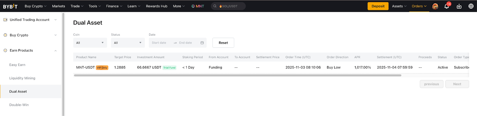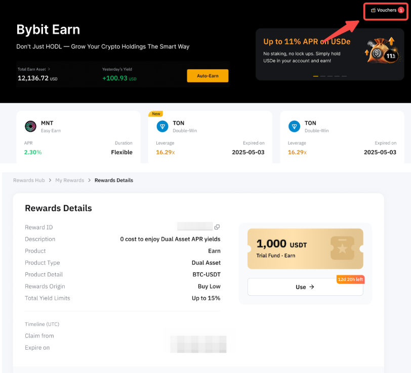 Si es elegible para un Fondo de Prueba para el producto Dual Asset, encontrará las recompensas en la página Bybit Earn en Voucher, ubicada en la esquina superior derecha. Como alternativa, también puede encontrar estas recompensas del fondo de prueba en la página Mis recompensas.