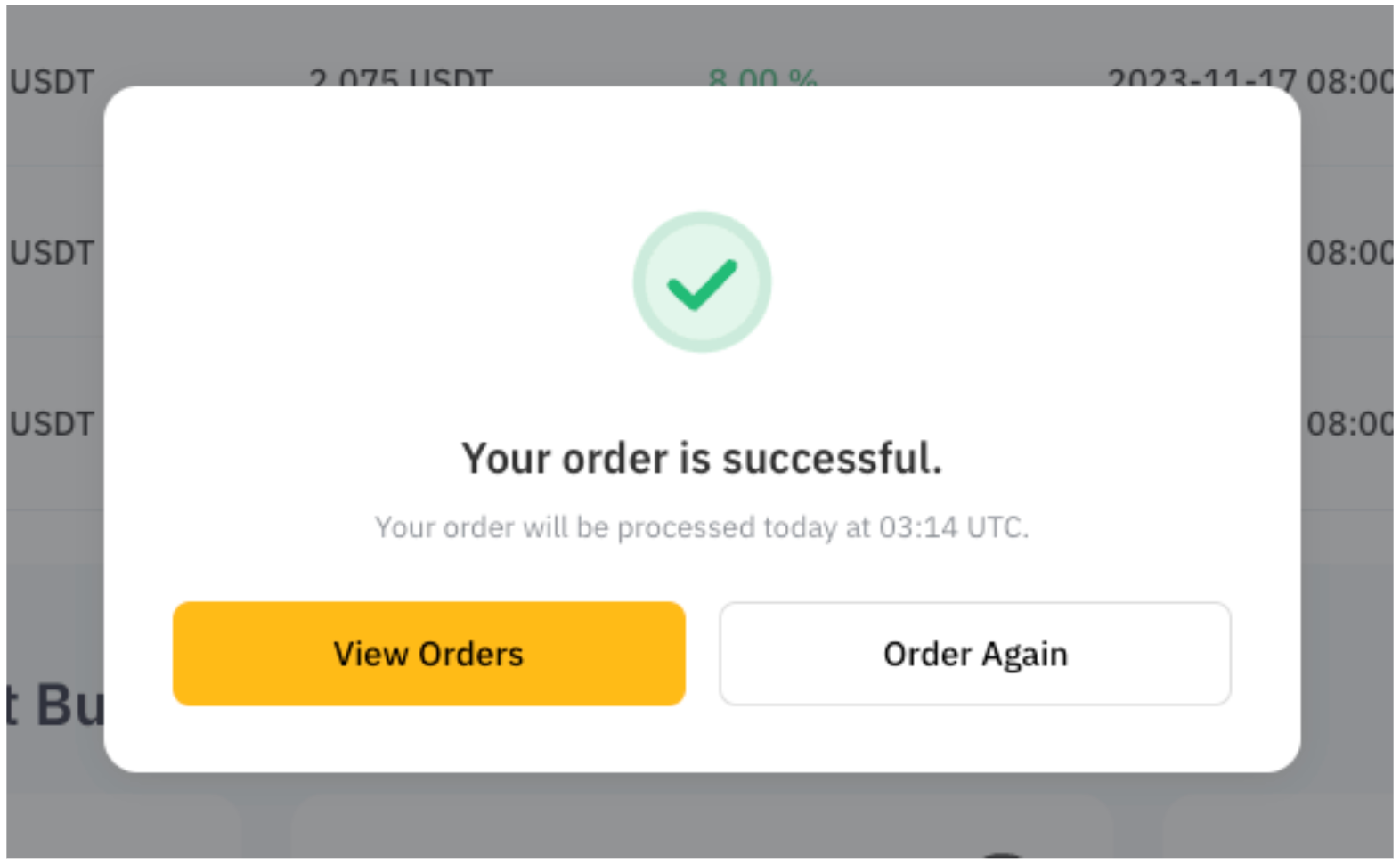 Para comprobar los detalles de tu historial de órdenes Discount Buy, haz clic en Ver mi orden en la ventana emergente de notificación de la orden.