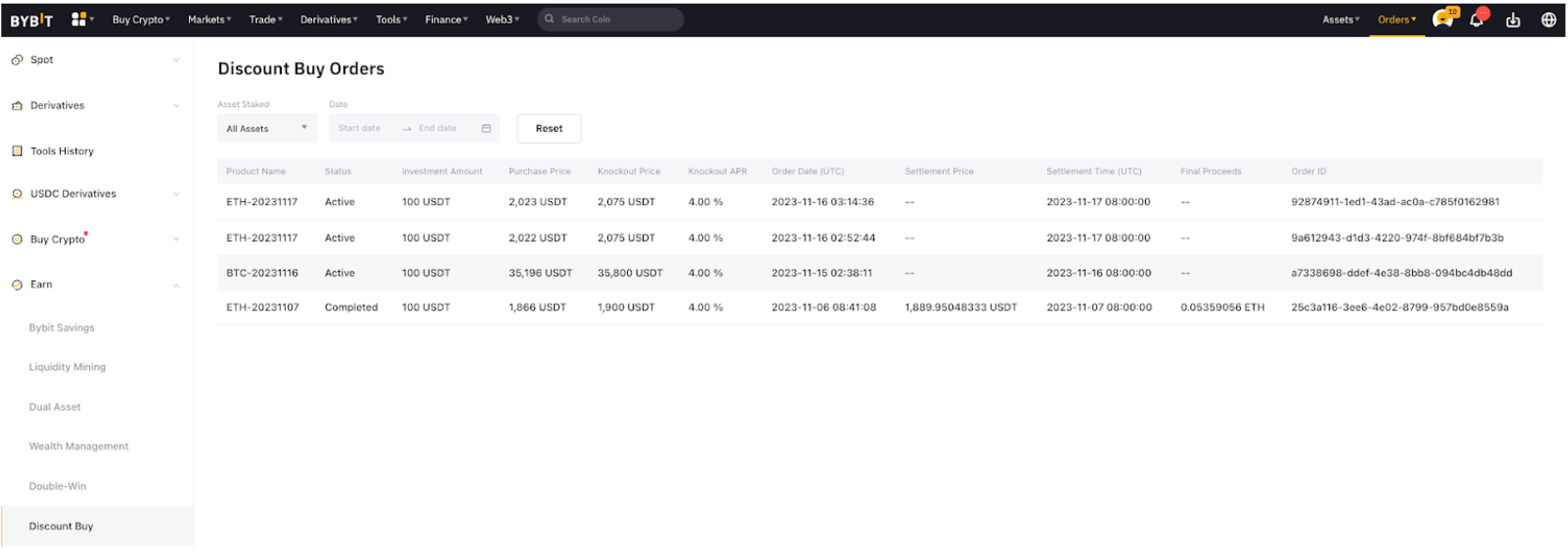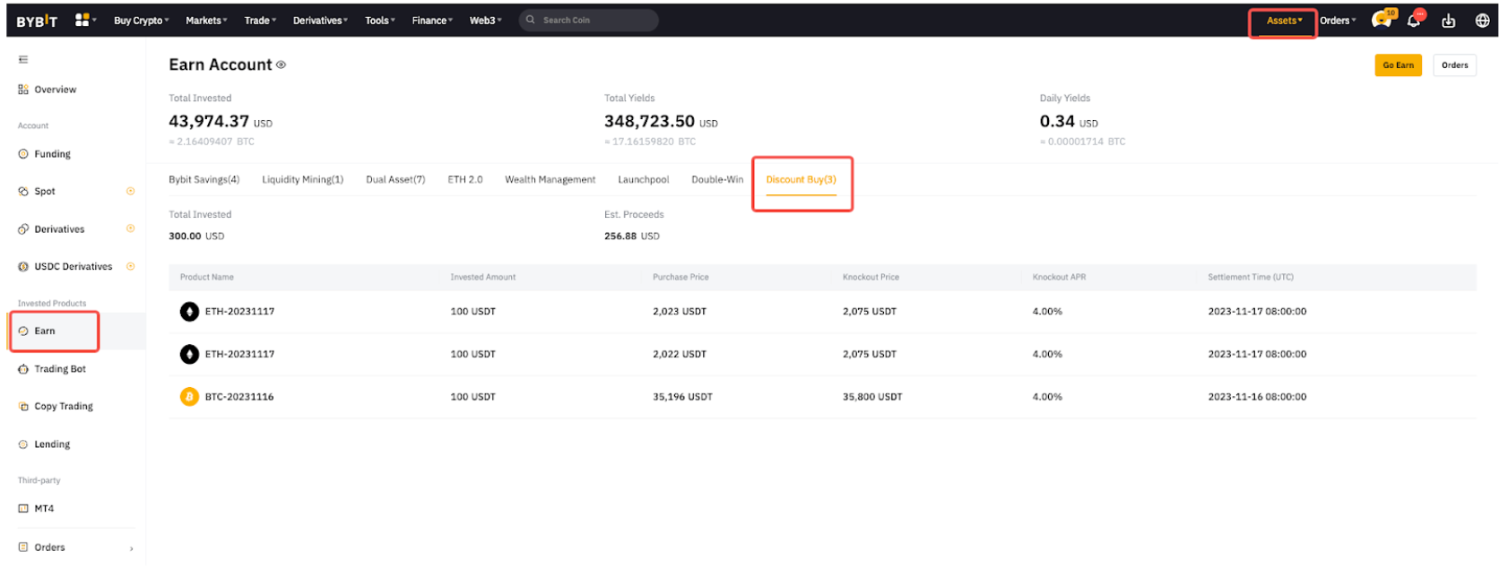 También puedes hacer clic en Activos en la parte superior derecha de la página de Bybit para acceder a la página de la Cuenta Earn. Desde allí puedes ver tus órdenes existentes.