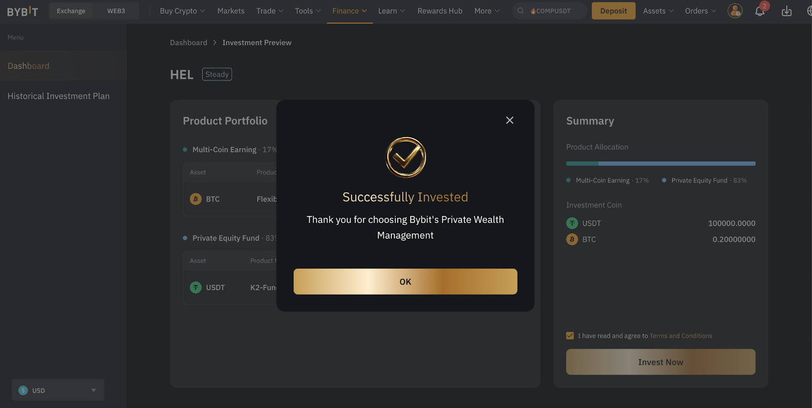 Ponte en contacto con un asesor patrimonial a través de la página Gestión de patrimonios privados de Bybit. Tu asesor personal evaluará tus objetivos financieros, preferencias de inversión y tolerancia al riesgo para diseñar una estrategia de inversión adecuada. Revisaremos internamente la información que nos envíes y nos pondremos en contacto contigo si cumples los requisitos exigidos.