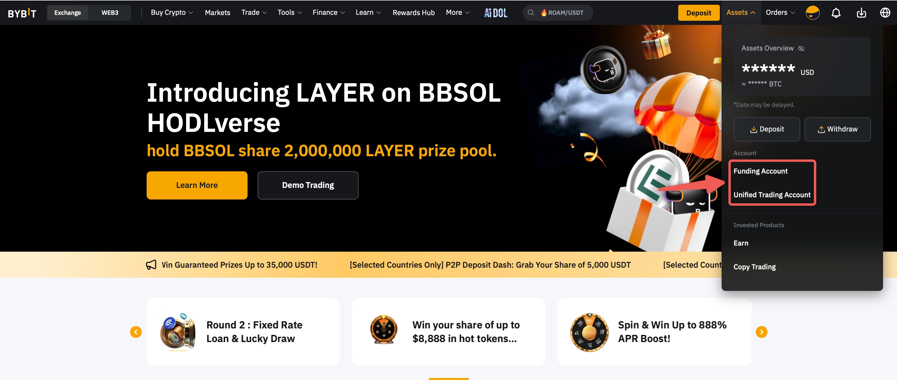 Paso 1: Haz clic en Activos en la esquina superior derecha de la página de inicio de Bybit y selecciona la cuenta en la que se encuentran tus fondos.