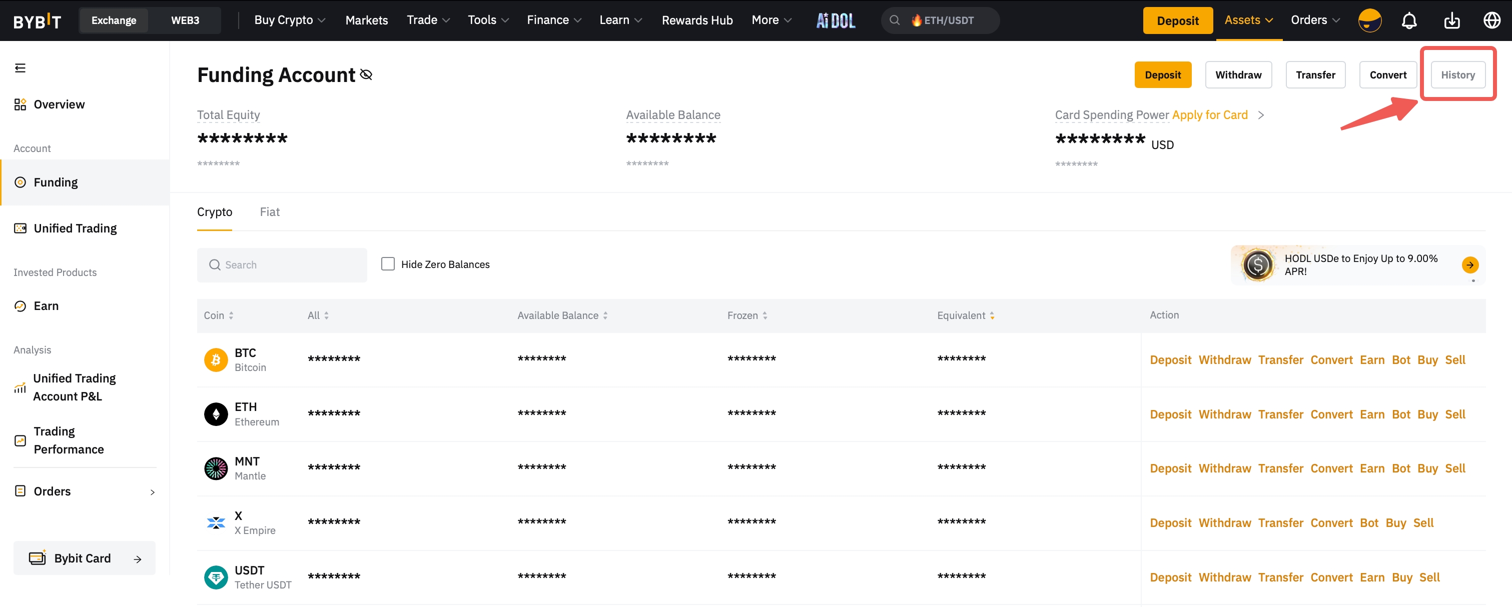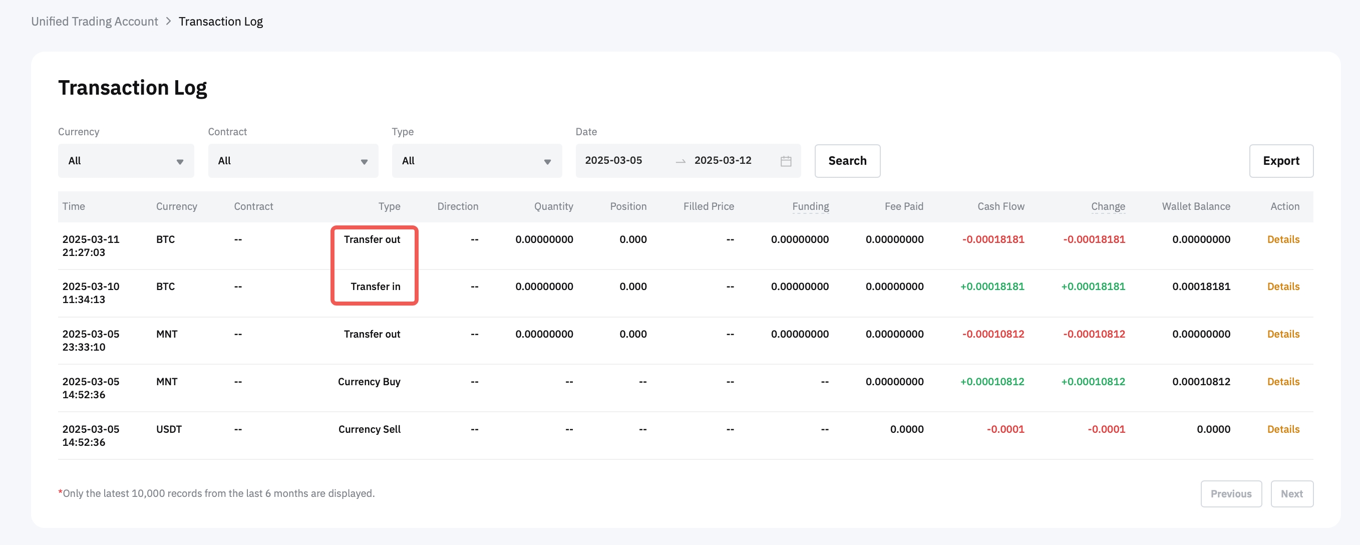 Selecciona una cuenta en el lado izquierdo de la página Activos para acceder a la página de cuenta correspondiente y, a continuación, haz clic en Transferir en la columna de moneda donde deseas procesar.