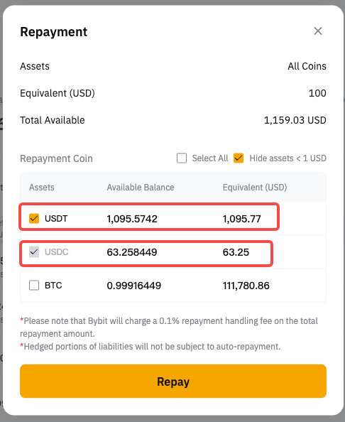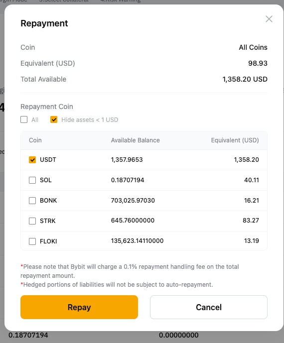 Step 2: The system will first use your available borrowed coin for repayment. Any remaining amount will be covered by converting your collateral into the borrowed coin.