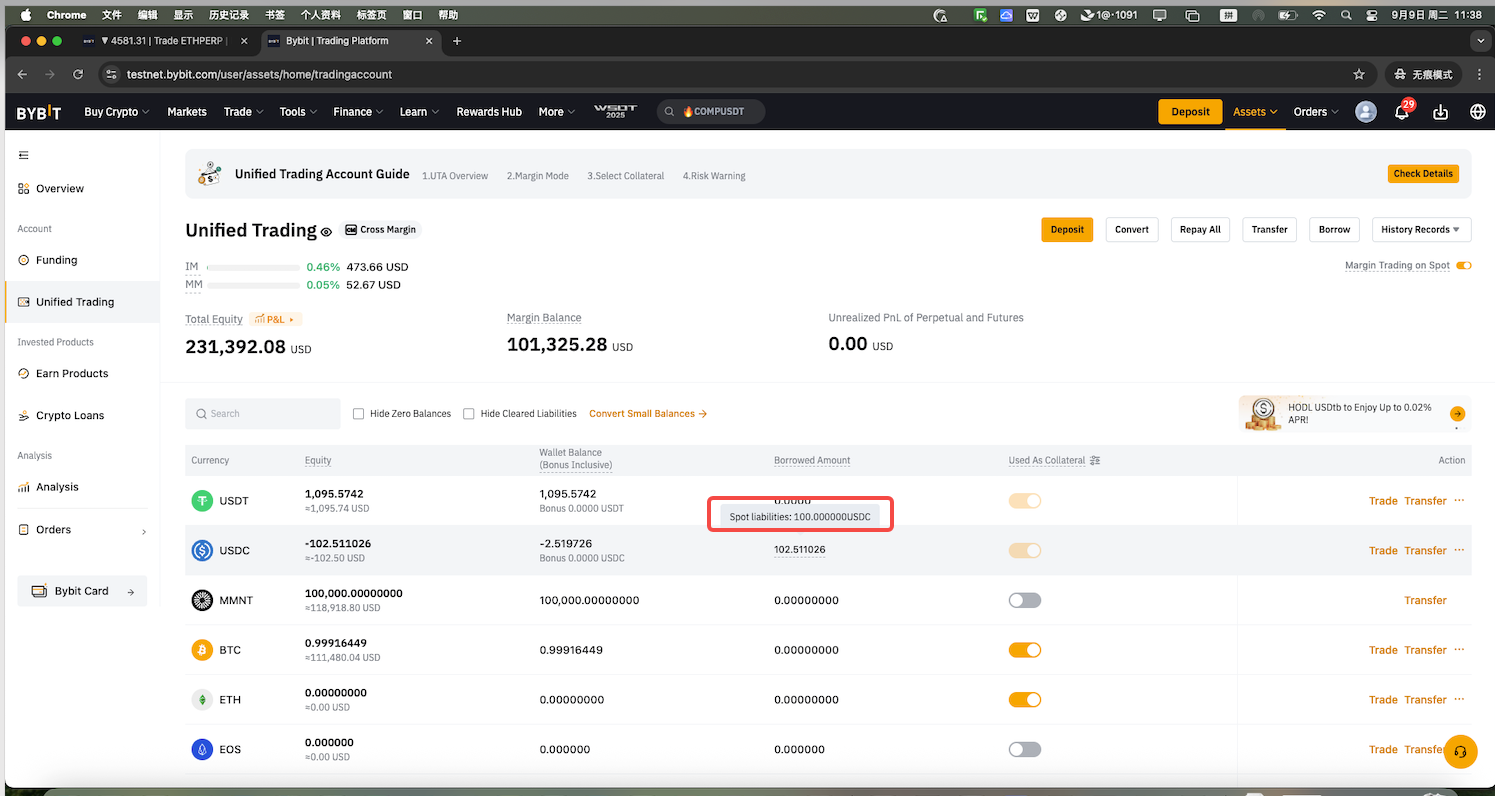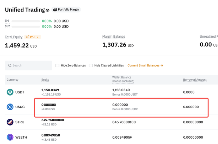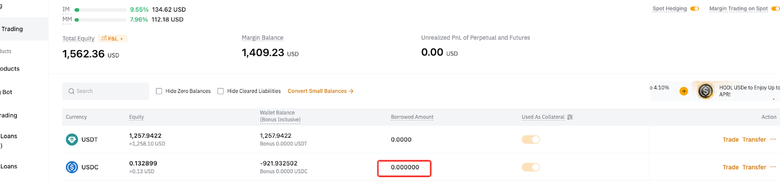 After transferring in USDC, only Derivatives liabilities are repaid automatically, while Spot liabilities remain unpaid.
