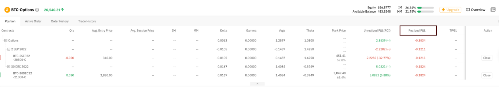 Bob vende un BTC-31DEC21-50000-C de 0,3 BTC con un precio promedio de entrada de 2.600 $. El precio del BTC sube, y cuando el precio de marca alcanza los 2.800 $, las pérdidas y ganancias no realizadas de la opción que posee son [(2.600 - 2.800) × 0,3] = -60 USDC. |
