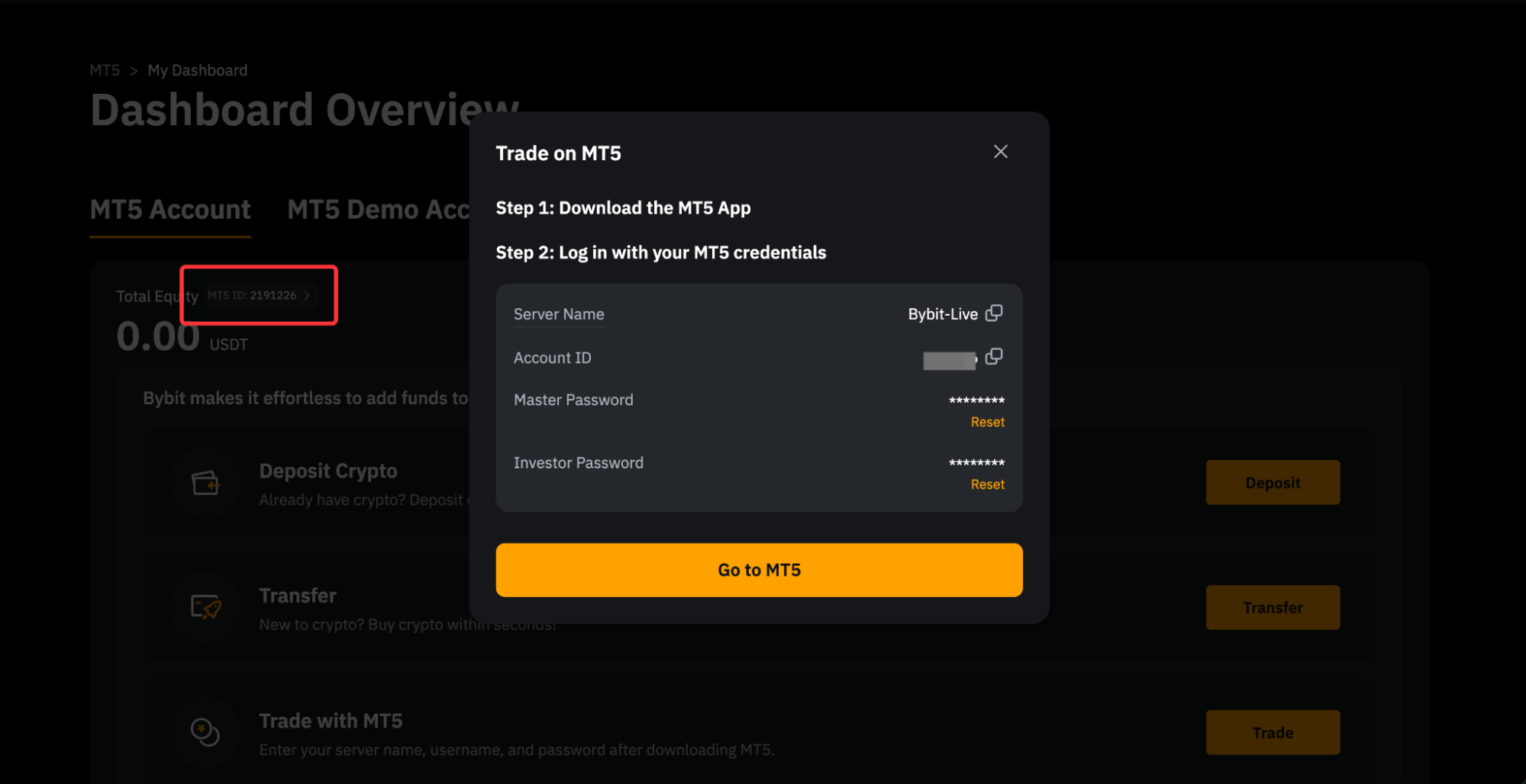 Paso 5: ve a tu panel de TradFi MT5 e inicia sesión en tu cuenta de MT5 con tus credenciales.