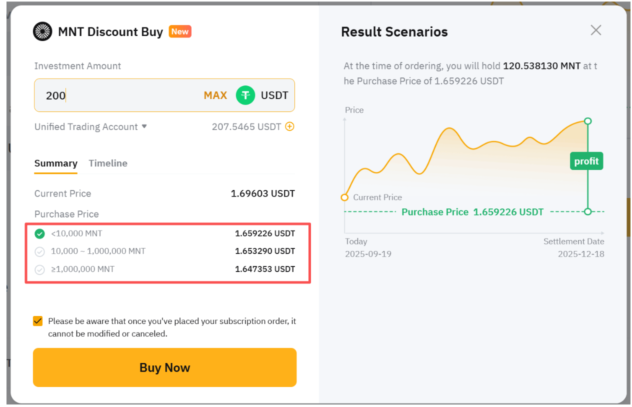 Discount Buy is an advanced earn product that allows you to buy crypto at a discounted price. Even if the purchase is not triggered, your principal will be returned with interest. Here's a step-by-step guide to help you get started with Discount Buy on Bybit.