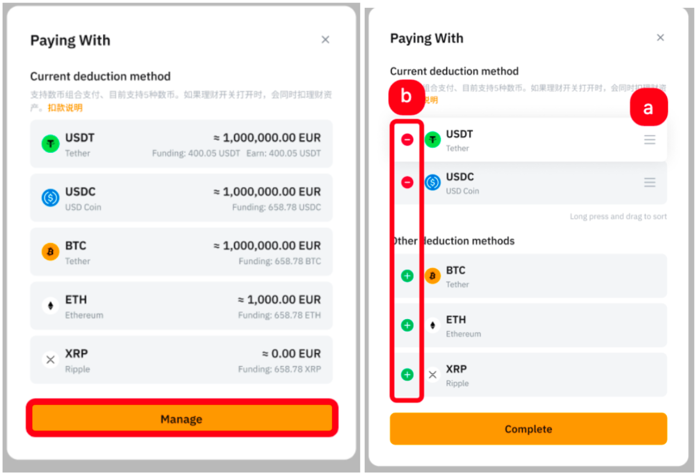 Klik Paying With dan Anda akan diminta untuk membuka jendela kelola. Kemudian, Anda dapat (a) mengelola pesanan dengan menariknya ke atas dan ke bawah atau (b) menambahkan dan menghapus koin dari daftar. Setelah selesai, Anda dapat melakukan pembelian menggunakan Kartu Bybit, sistem akan mengikuti prioritas pembayaran yang telah Anda tetapkan.