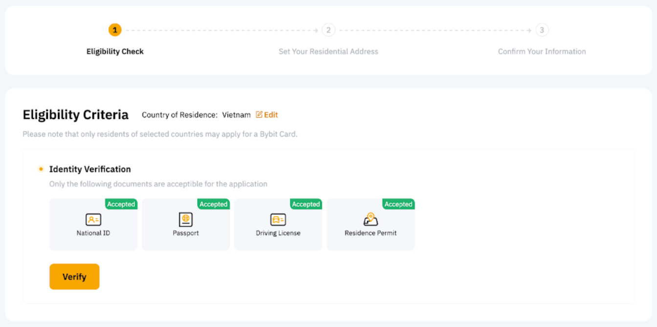 Catatan: Kartu Bybit memiliki persyaratan yang lebih ketat untuk Verifikasi Identitas. Oleh karena itu, Anda mungkin diminta untuk memperbarui Verifikasi Identitas Anda meskipun Anda telah menyelesaikannya di akun Bybit Anda sebelumnya.
