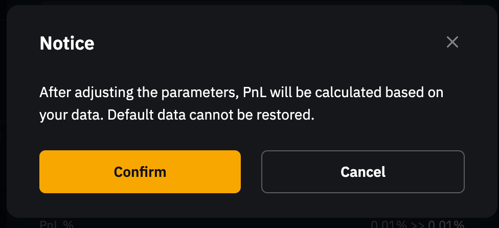 Langkah 3: Pop-up konfirmasi akan memberi tahu Anda bahwa L&R dan % L&R akan dihitung ulang berdasarkan data yang diperbarui. Anda dapat melihat L&R dan % L&R yang diperbarui di L&R, yang terletak di sebelah Aset di bagian bawah laman trading. Harap diperhatikan bahwa penyesuaian tidak dapat dibatalkan. Untuk melanjutkan, klik Konfirmasi.
