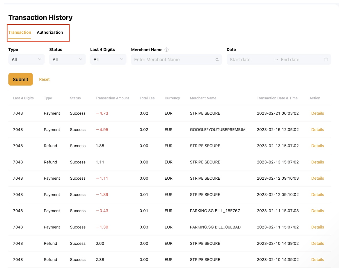 Langkah 2: Pada halaman Riwayat Transaksi, Anda dapat melihat detail transaksi Anda pada Transaksi dan Otorisasi. Anda dapat menggunakan jenis filter di bawah ini untuk menemukan catatan transaksi yang ingin Anda lihat dengan lebih tepat. Lalu, klik Kirim.