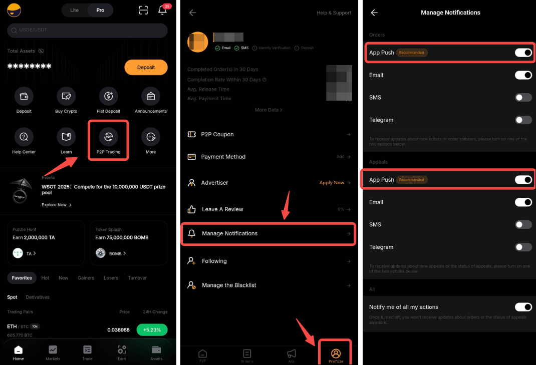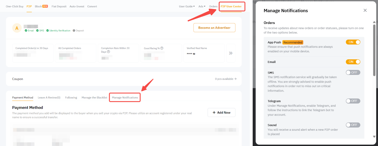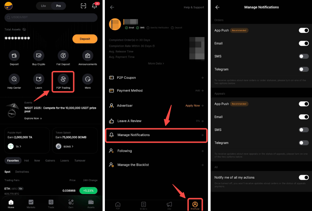 Anda dapat mengendalikan notifikasi seperti push Aplikasi, Telegram, Email, dan SMS untuk pesanan P2P dan banding melalui Pusat Pengguna P2P.