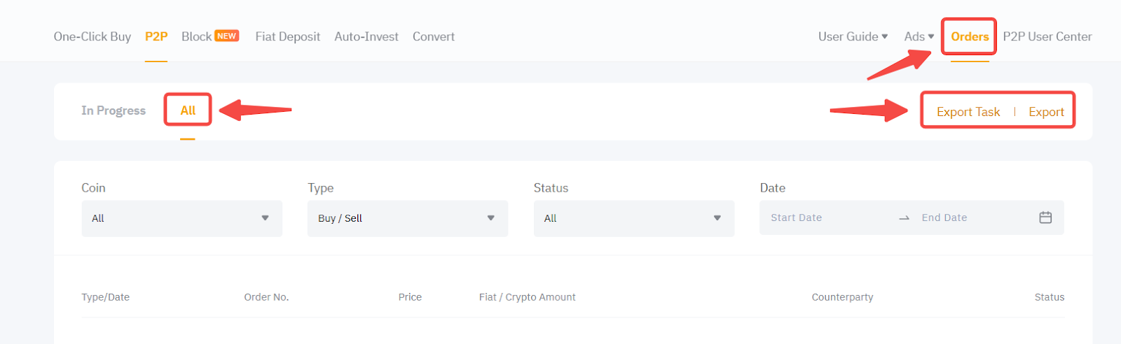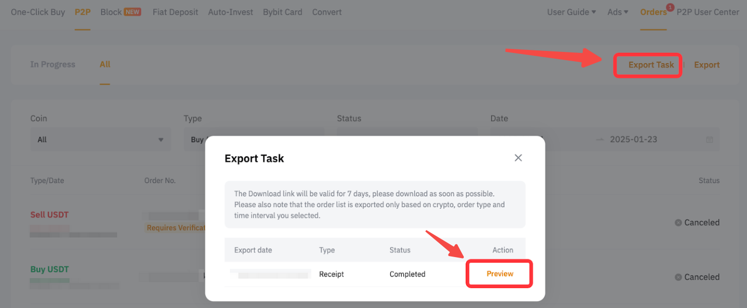 Anda dapat mengekspor informasi pesanan P2P Anda dengan mengeklik tombol Ekspor di sudut kanan atas halaman ini. Harap dicatat bahwa fungsi Ekspor hanya tersedia di situs web Bybit.