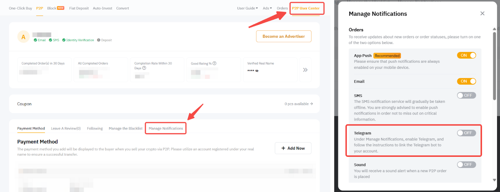 1. Buka halaman Pusat Pengguna P2P, klik Kelola Notifikasi untuk mengaktifkan notifikasi Telegram, ikuti petunjuk pada halaman untuk menyelesaikan pengikatan, dan tambahkan Bot sebagai kontak.