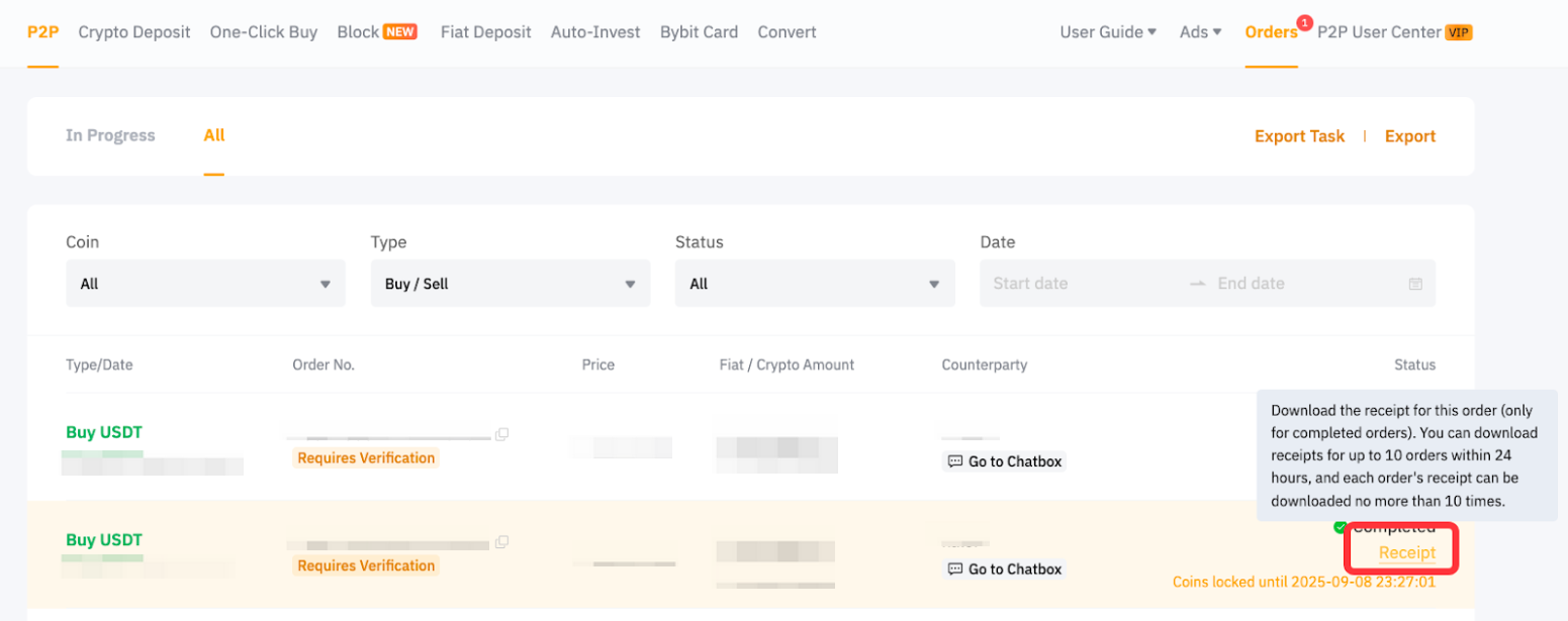 Ya, Anda dapat mengunduh tanda terima pesanan P2P dengan mengeklik Tanda Terima di halaman Daftar Pesanan. Fungsi unduh tersedia untuk pesanan yang diselesaikan dan tanda terima hanya dapat diunduh dari situs web Bybit.