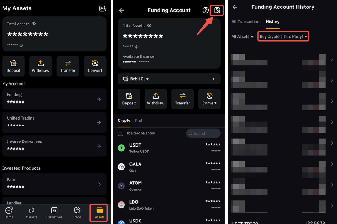 入金記録は、Bybit資産画面のワンクリック購入の下にあるサードパーティ経由で暗号資産を購入タブから確認することができます。