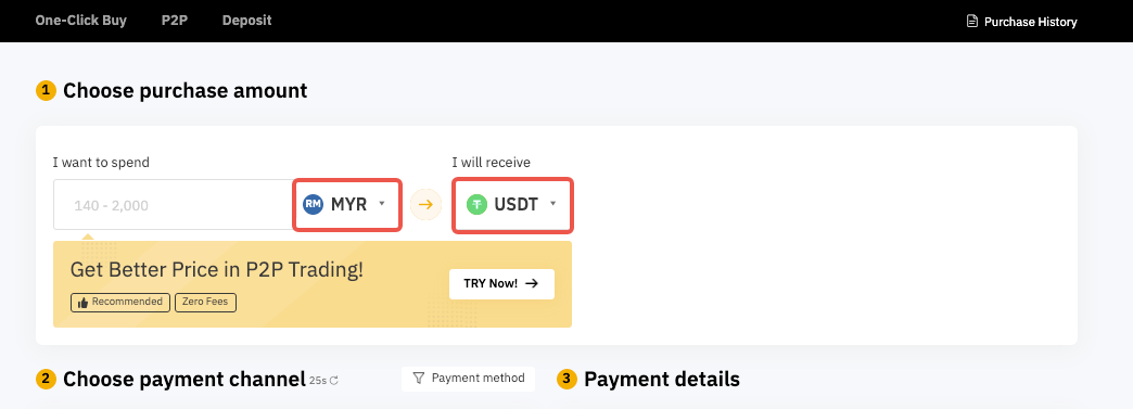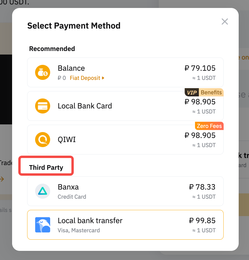 サポートされている法定通貨と仮想通貨のオプションのリストは、ワンクリック購入ページで確認できます。また、サードパーティの決済方法も利用できます。または、法定通貨または通貨のドロップダウンリストをクリックして、サードパーティ注文ページに移動することもできます。