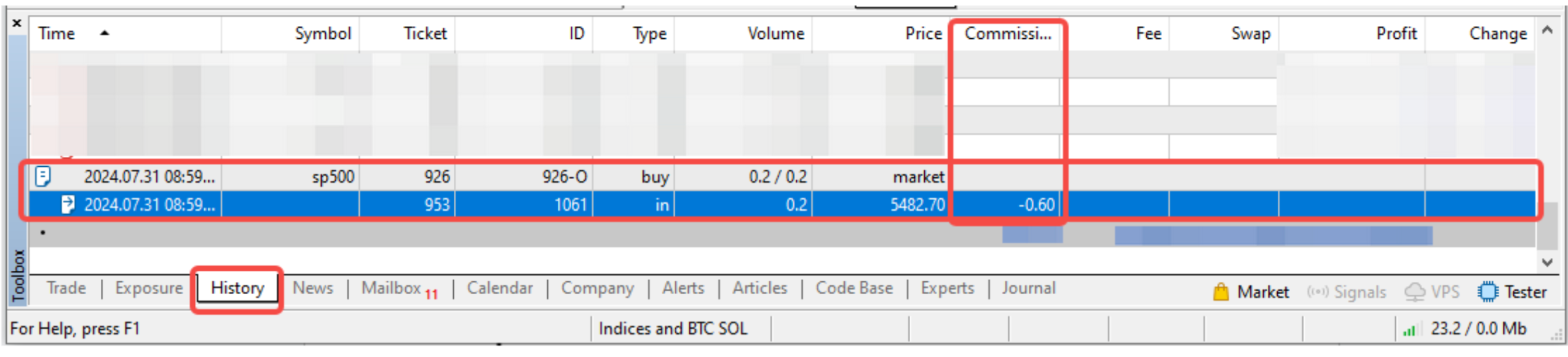 手数料はポジションの参入時に直接請求され、MT5アカウント残高から直接差し引かれます。MT4とは異なり、手数料欄はMT5ターミナルの取引タブには表示されなくなりましたが、履歴タブにのみ表示されます。