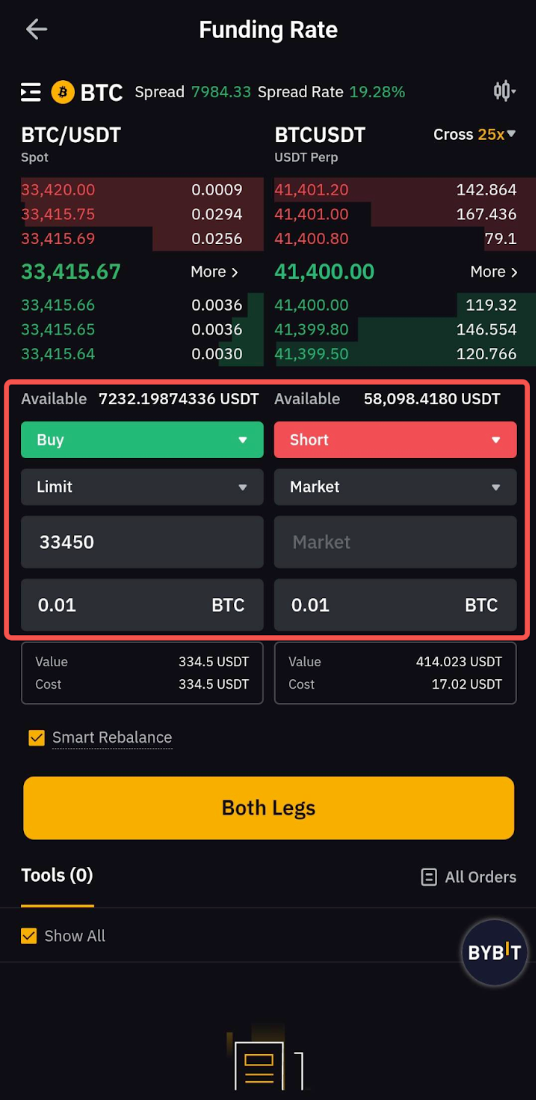 Suppose BTCUSDT Perpetual currently has a positive funding rate of +0.01%. Short position holders will receive funding fees from long position holders. Hence, Trader A can leverage Arbitrage tools by simultaneously buying 1 BTC in the Spot Market to profit from price rises and shorting 1 BTC to profit from price drops in the Perpetual Market. This hedging portfolio allows Trader A to balance potential losses in one market with profits from the other, while earning funding fees.