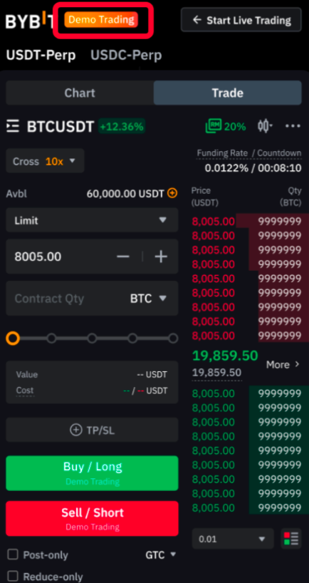 On the Bybit App, you can find the Demo Trading entrance from the profile settings page. When you are on the Demo Trading page, click on Start Live Trading in the upper right corner of the trading page to go back to live trading.