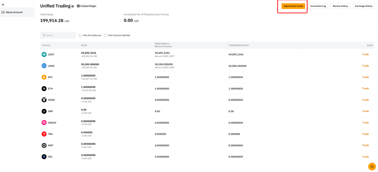 Currently, Demo Trading is an account in Unified Trading Account (UTA) mode. This allows traders to engage in simulated trading for both Spot and Derivatives Trading in UTA.