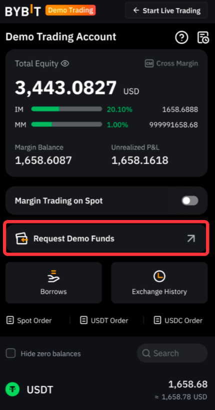 Upon initializing your Bybit Demo Account, you will automatically receive simulated assets of 50,000 USDT, 50,000 USDC, 1 BTC, and 1 ETH. There's no need to request funds manually.