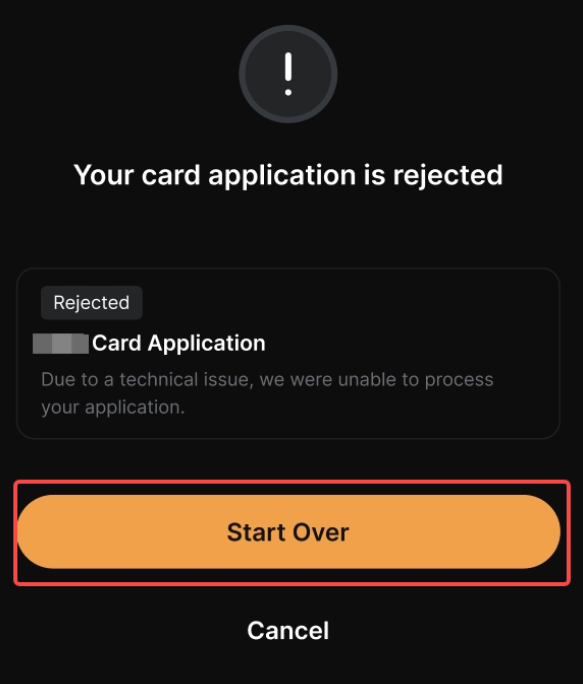 • If your card application got rejected after submission, you can always Start Over with a new application.