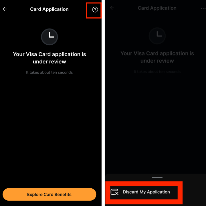 On the app, you can click on View my application and then on the '?' button. Then, choose Discard My Card Application.