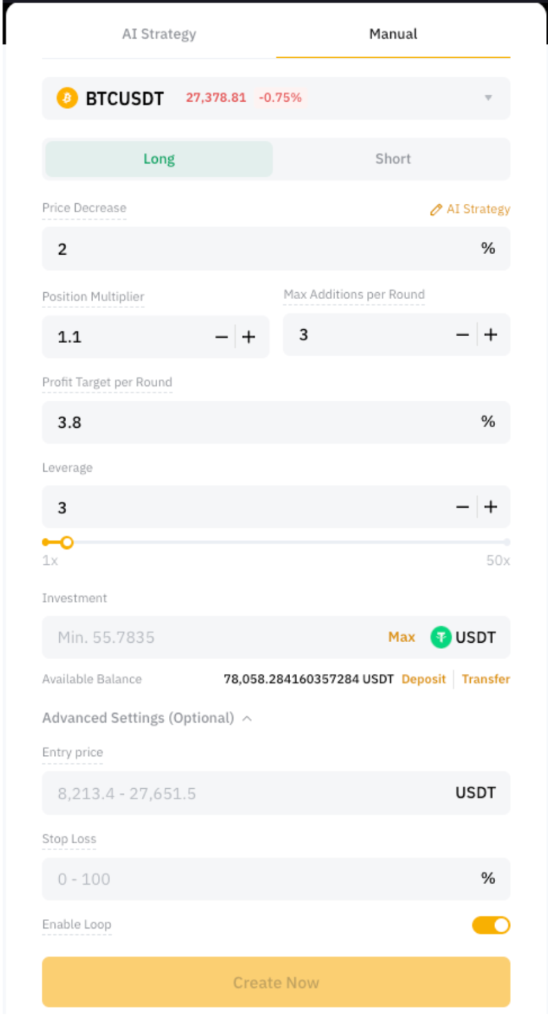 Na interface do robô de Martingale de Futuros, você pode escolher entre dois modos ao criar um robô: Estratégia de IA ou modo Manual. No modo Estratégia de IA, os parâmetros são ajustados automaticamente para executar a estratégia ideal determinada pela IA, com base em dados históricos.
