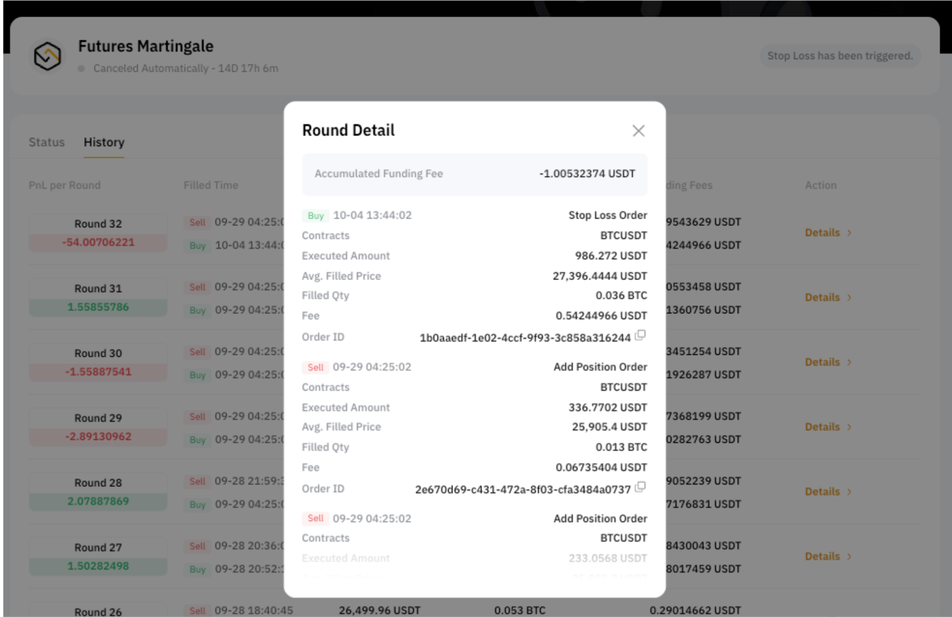 A página de histórico do robô mostra detalhes de P&L realizados para as rodadas anteriores. Clique em Detalhes e você verá o histórico de ordens e as taxas acumuladas para cada rodada.
