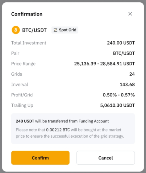 When the market price reaches or exceeds $31,000 (the upper limit + interval), the bot will shift the range up by one grid, canceling the lowest buy order at $25,000 and placing a new buy order at $30,000 (the previous upper limit).