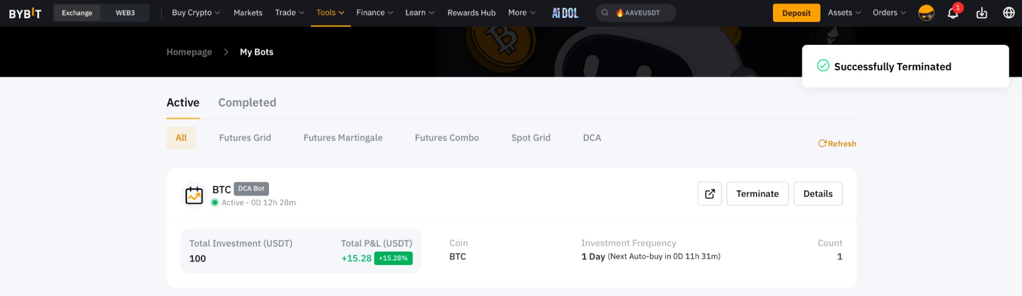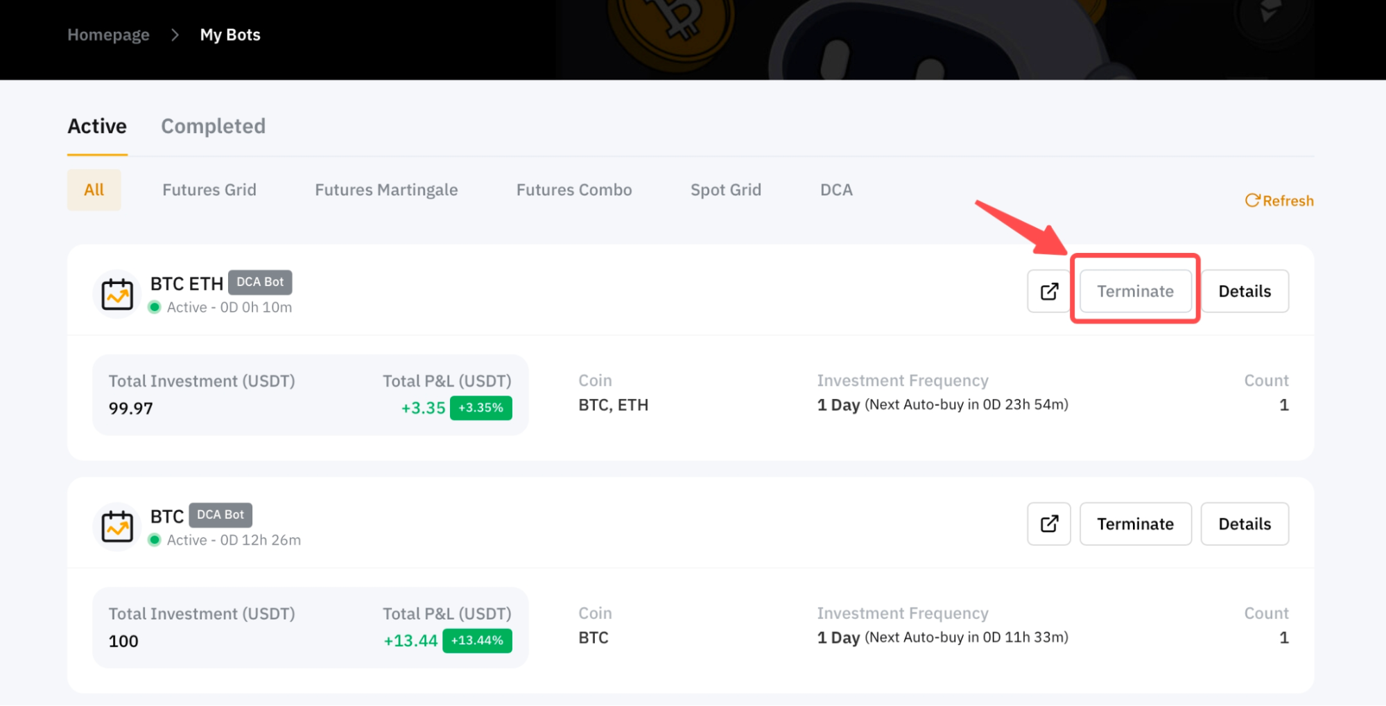 2º passo: Clique em Encerrar, no canto superior direito do Bot DCA a ser encerrado.