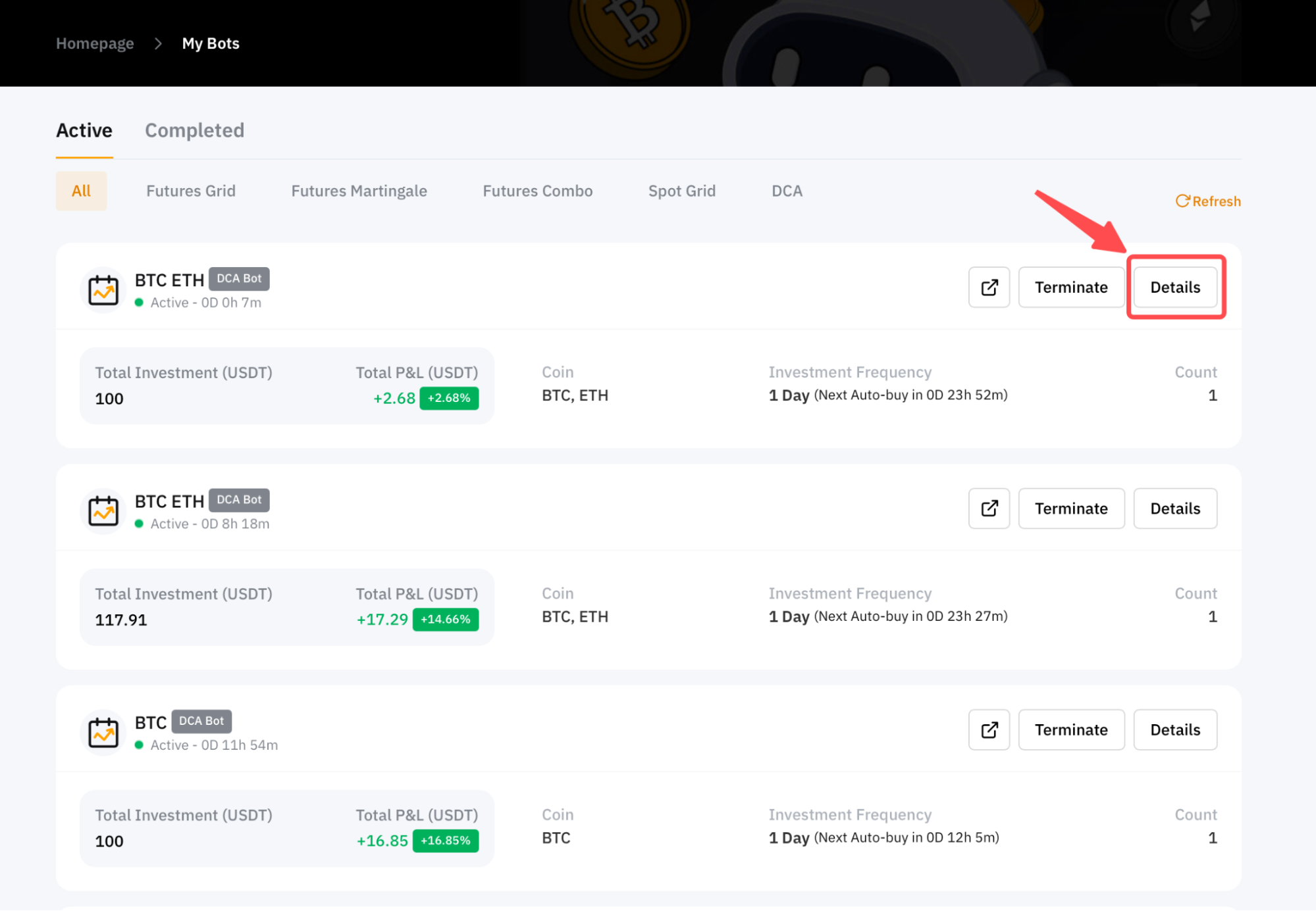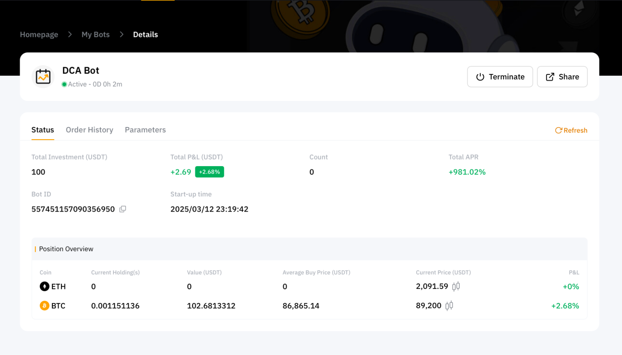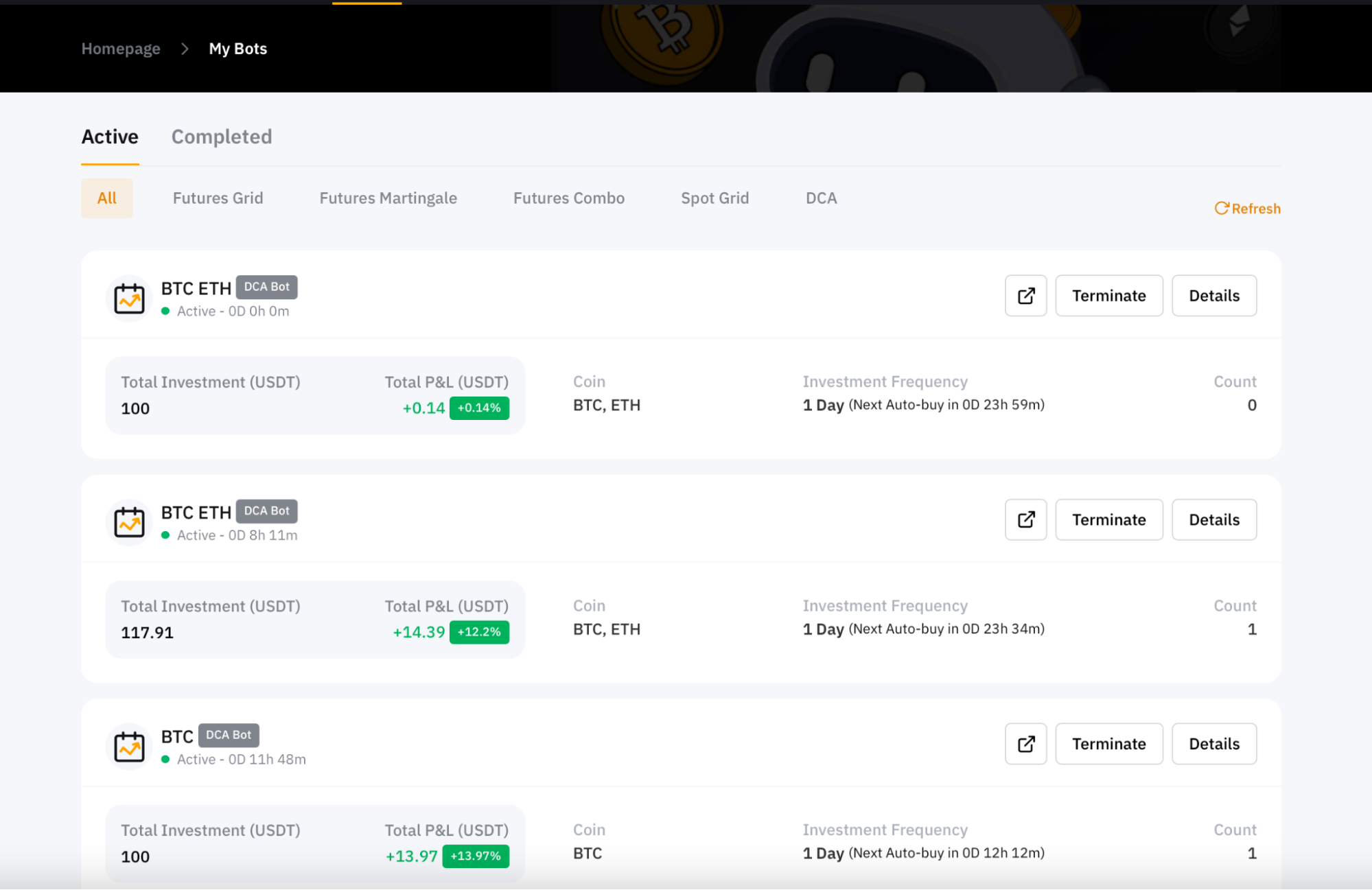 Após clicar em Confirmar, a página irá direcionar você para a página Meus Bots. Aqui, você poderá ver os Bots DCA ativos em sua conta.