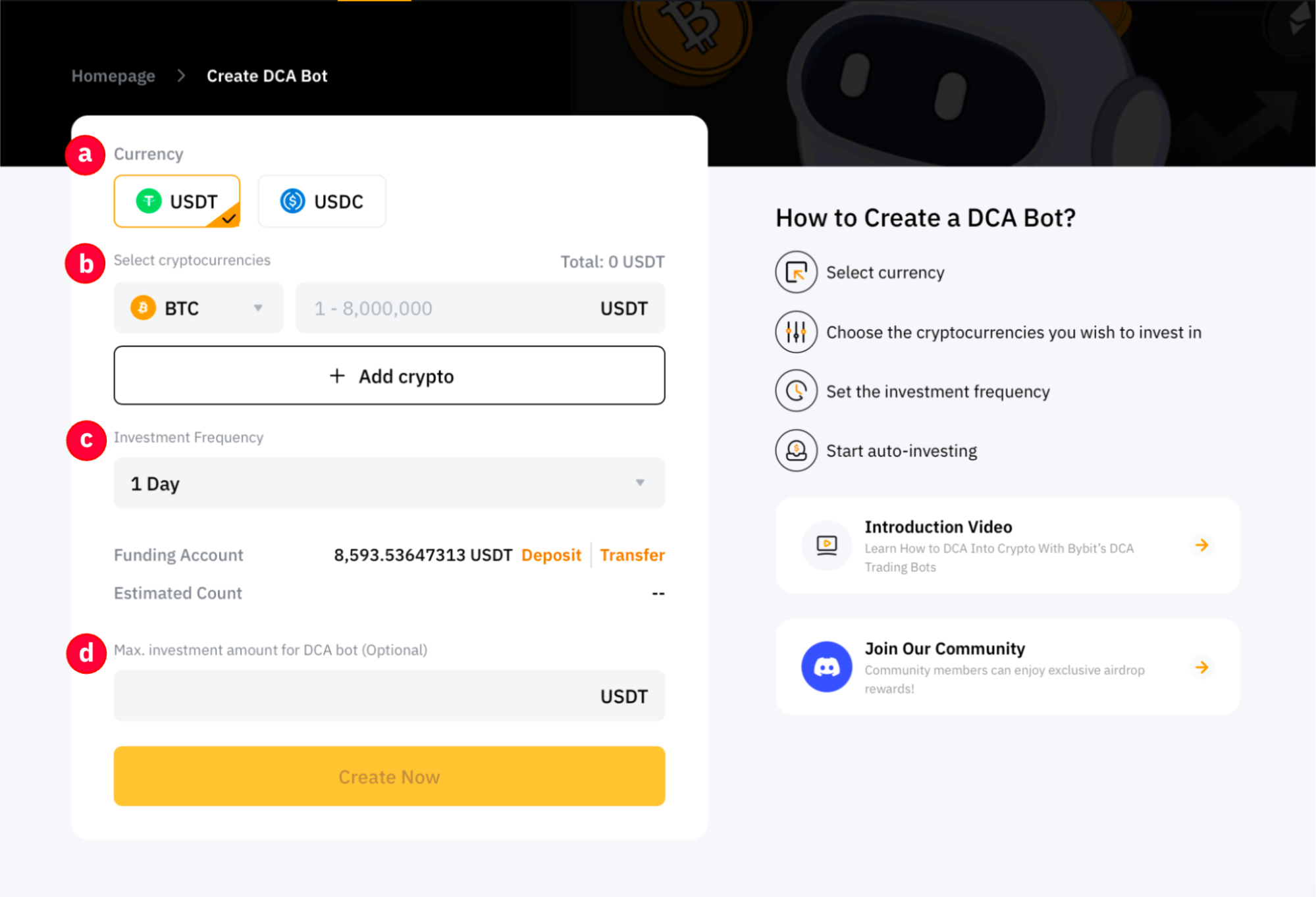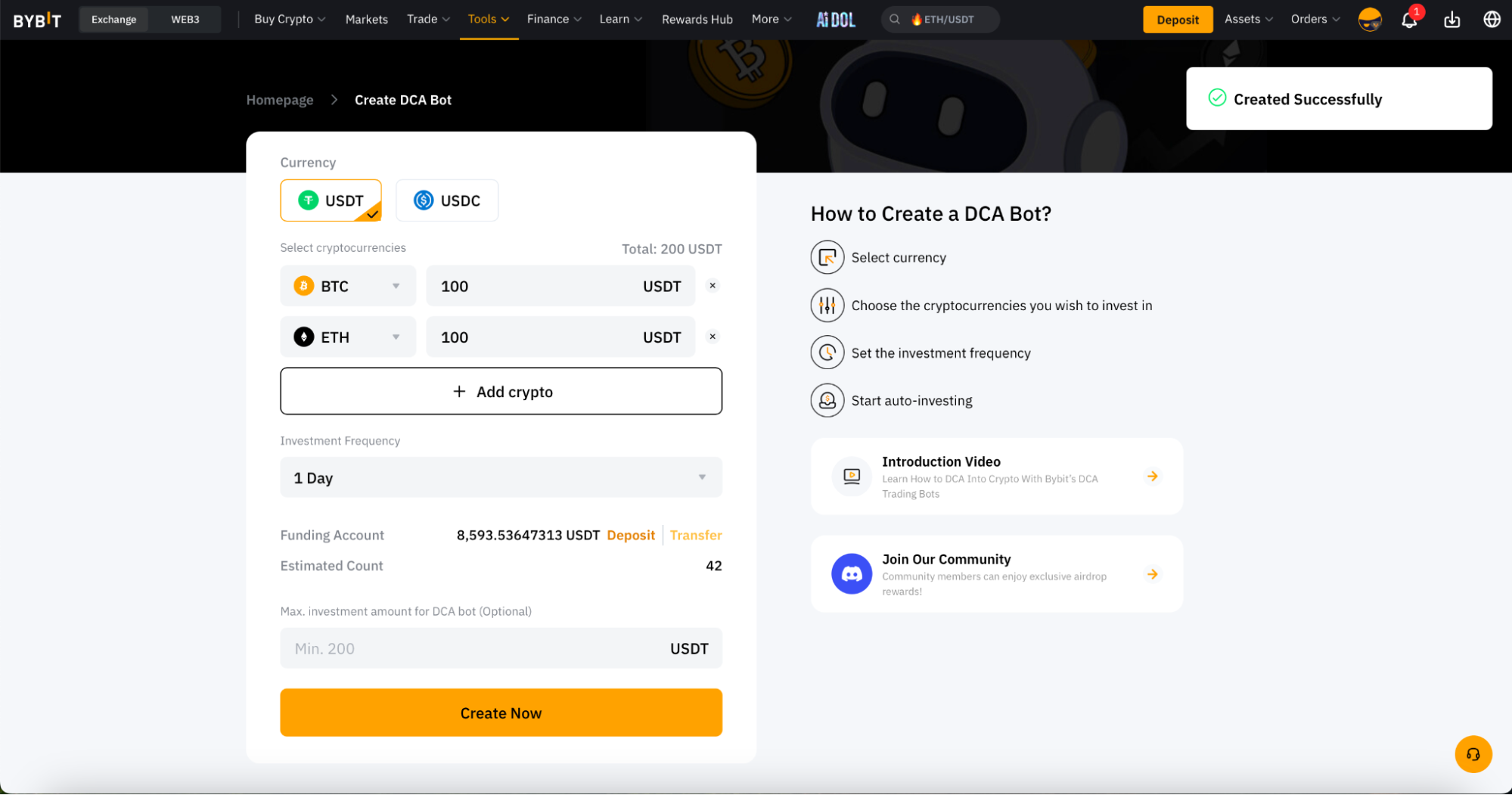 O seu primeiro investimento em DCA começa quando você cria um Bot DCA.