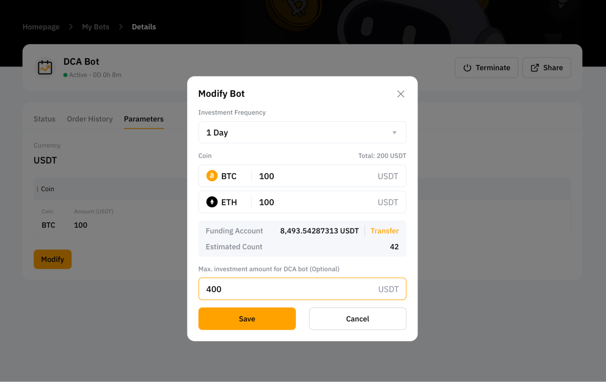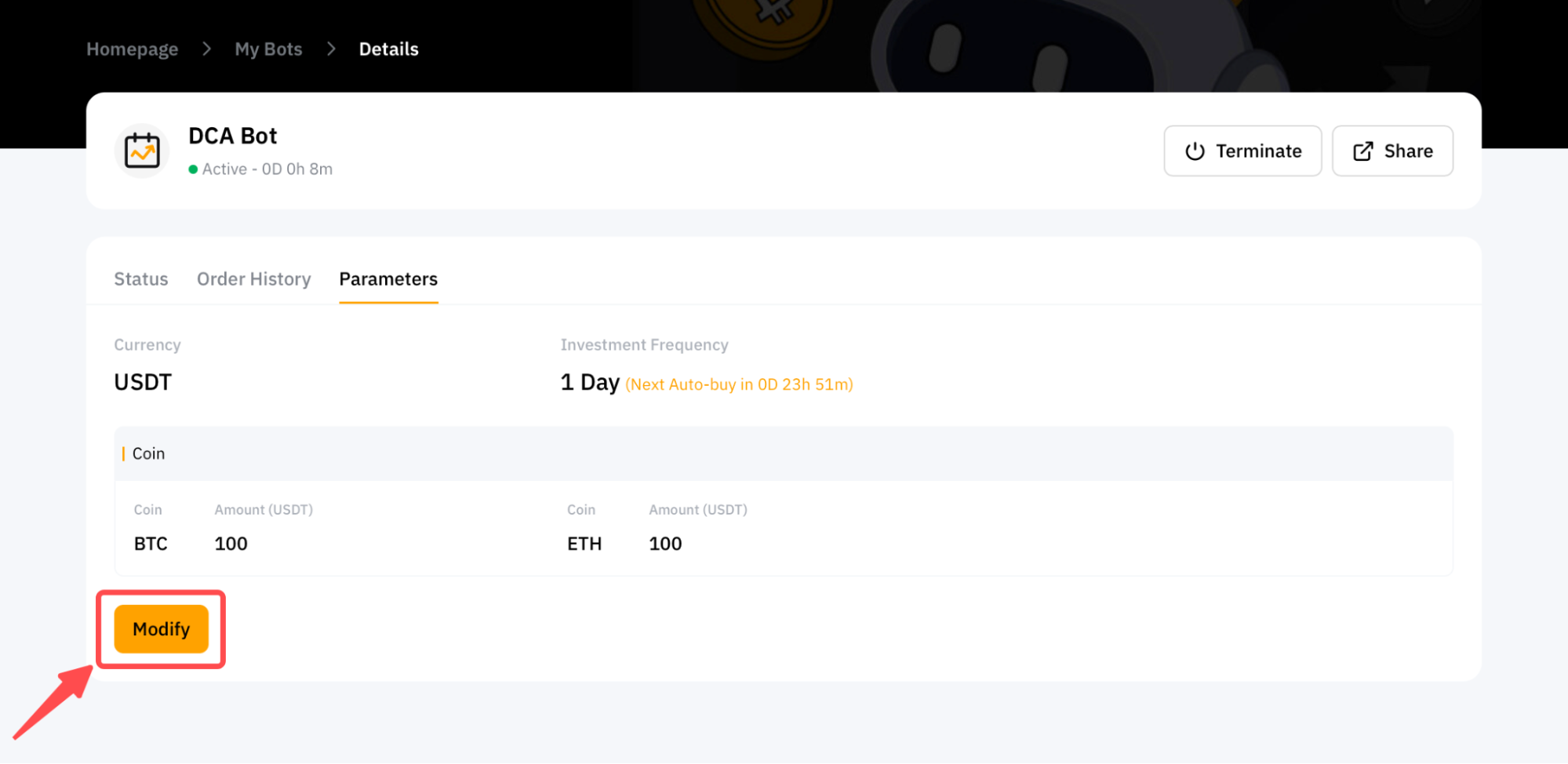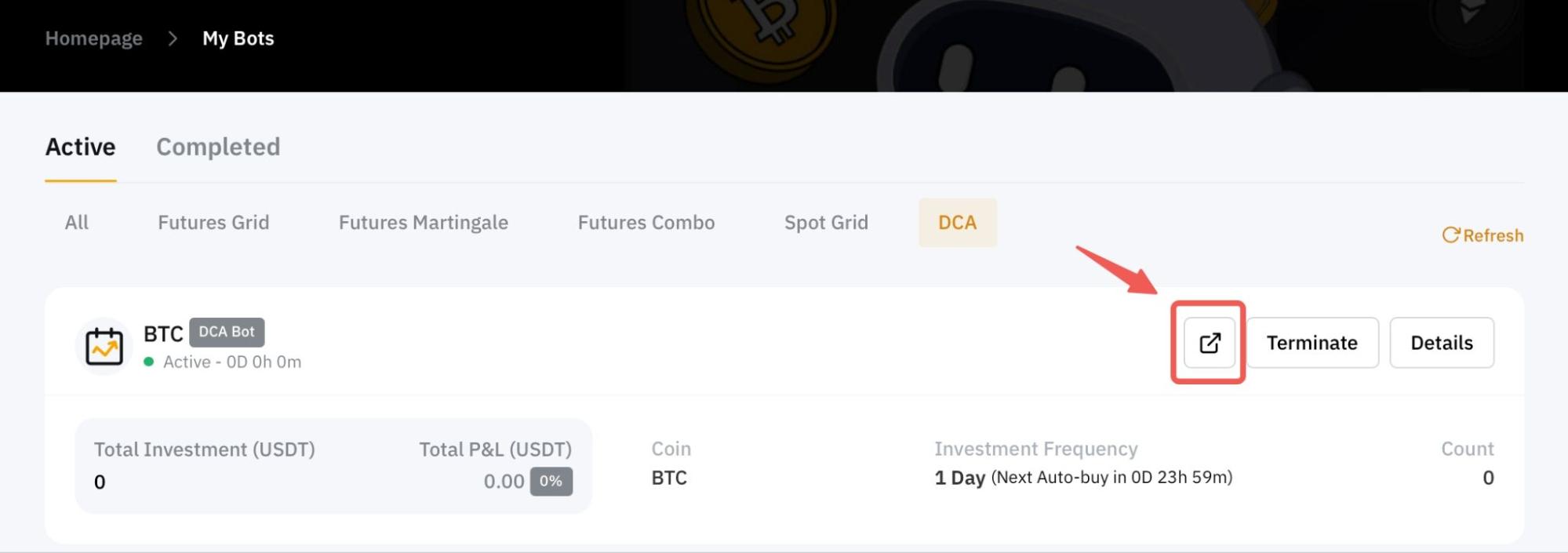 Observação: Atualmente, os Bots DCA não têm suporte ao Copy Trading.