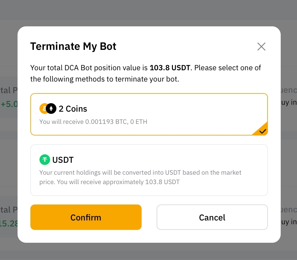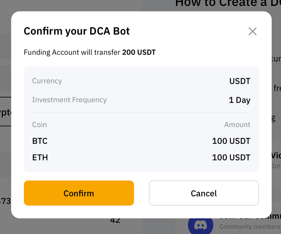4º passo: Revise as informações do Bot DCA que você criou e, então, clique em Confirmar para começar a fazer trades.