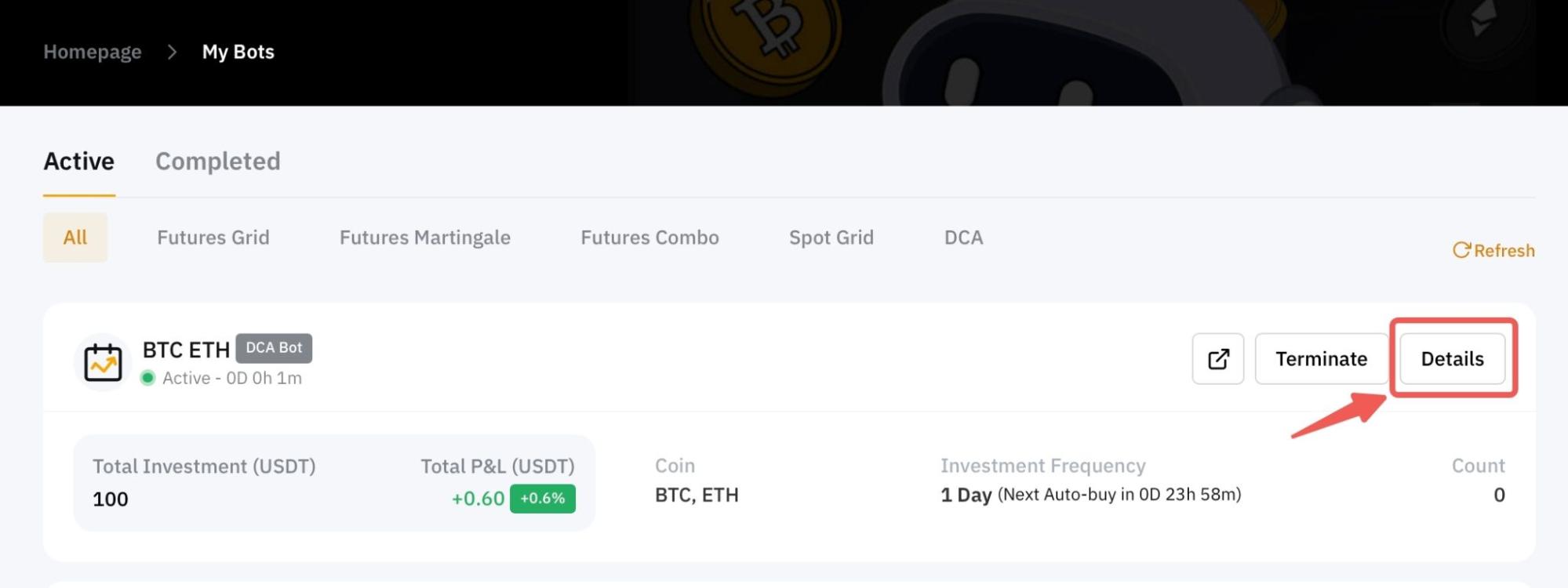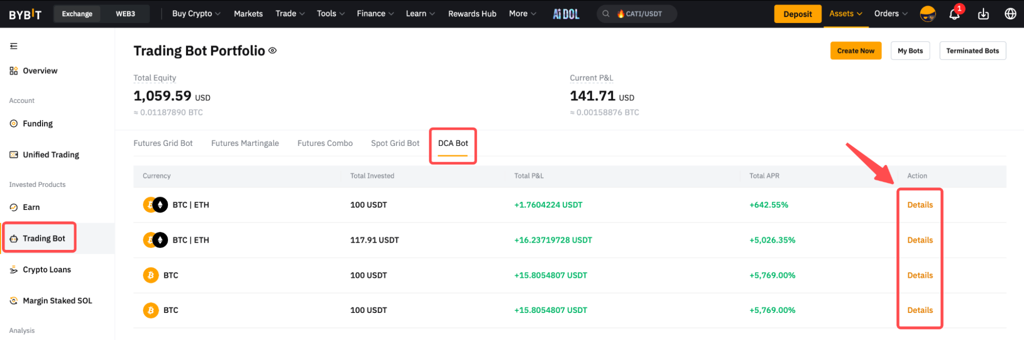 1º passo: clique em Ver meus bots, no canto superior esquerdo da página Robô de trading da Bybit. Clique em Detalhes, no canto superior direito do Bot DCA que você deseja modificar.