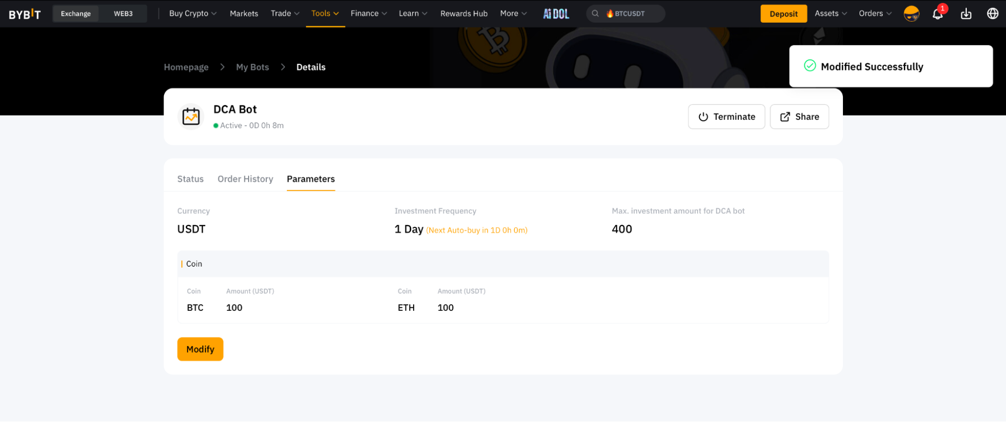 Observação: Cada investimento fixo fica sujeito ao valor máximo e mínimo da ordem em cada transação no mercado Spot. Para mais informações, acesse o Manual de trading em spot da Bybit.
