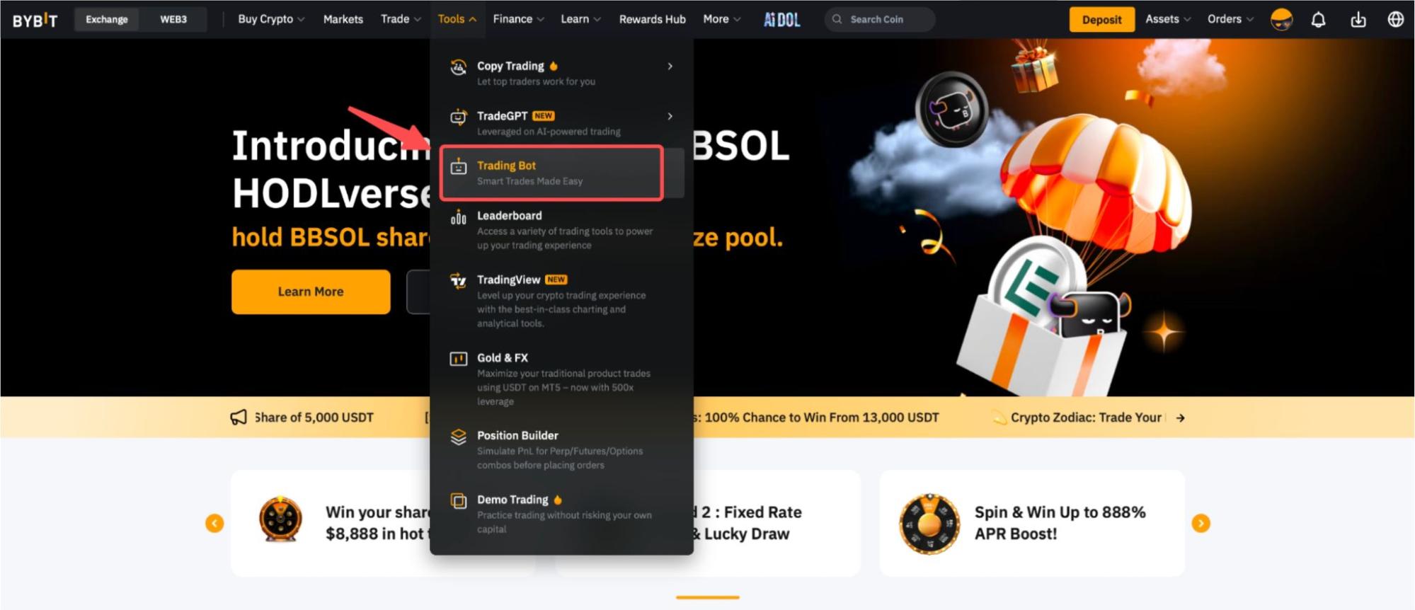 1º passo: Clique em Ferramentas → Robô de Trading na barra de navegação para entrar na página Robô de Trading da Bybit.