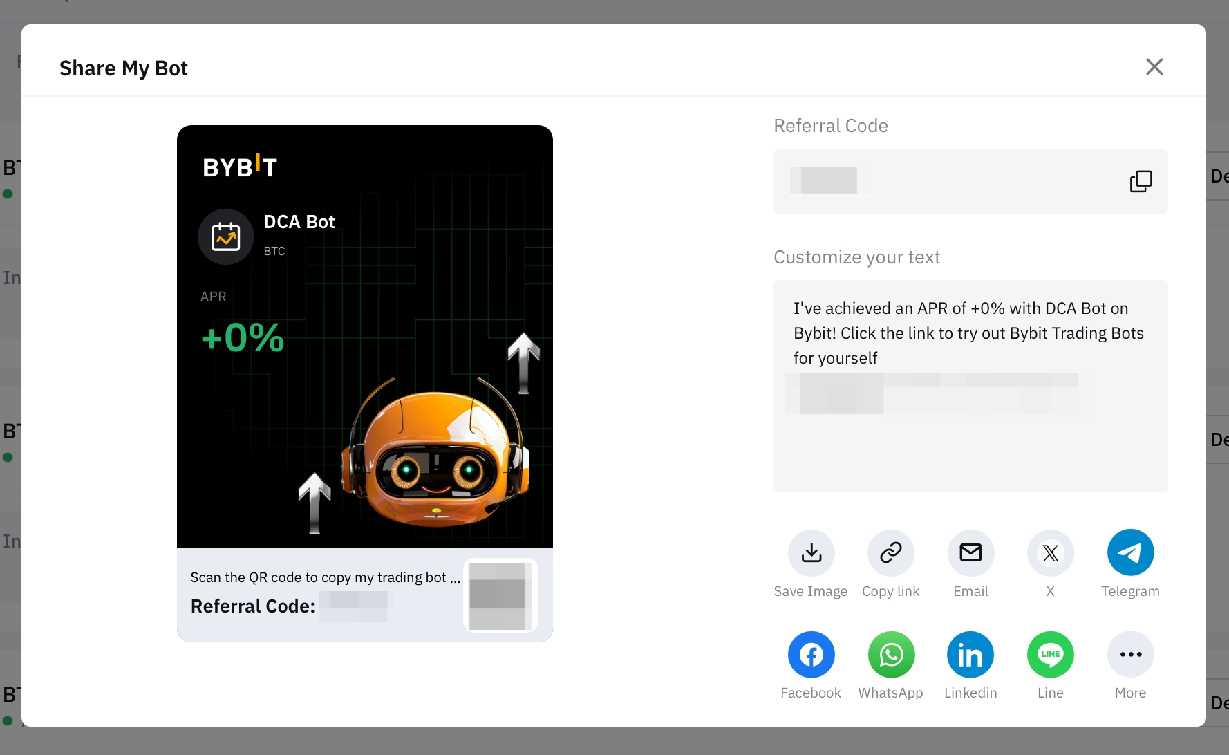 2º passo: Clique no ícone de copiar para compartilhar a URL da página do seu Robô de trading da Bybit com seus amigos.