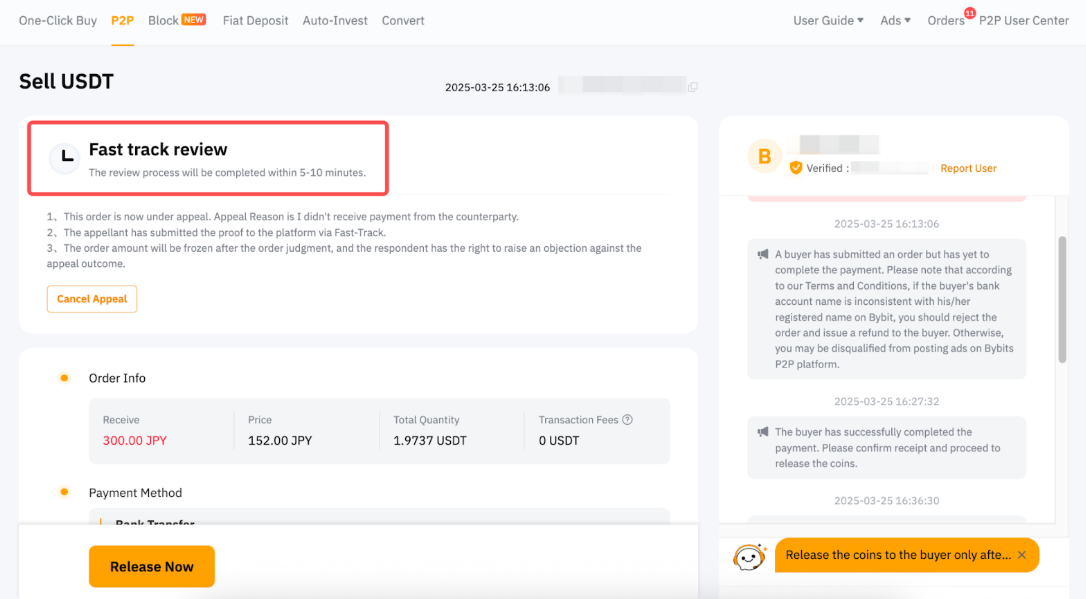 Um especialista em risco e recursos P2P exclusivo participará da caixa de bate-papo de ordens P2P dentro do tempo estimado para ajudá-lo ainda mais com base no primeiro a entrar e primeiro a sair (FIFO) assim que você enviar seu recurso com sucesso. Siga as instruções para evitar que seu recurso seja cancelado automaticamente e certifique-se de que seja processado sem problemas.